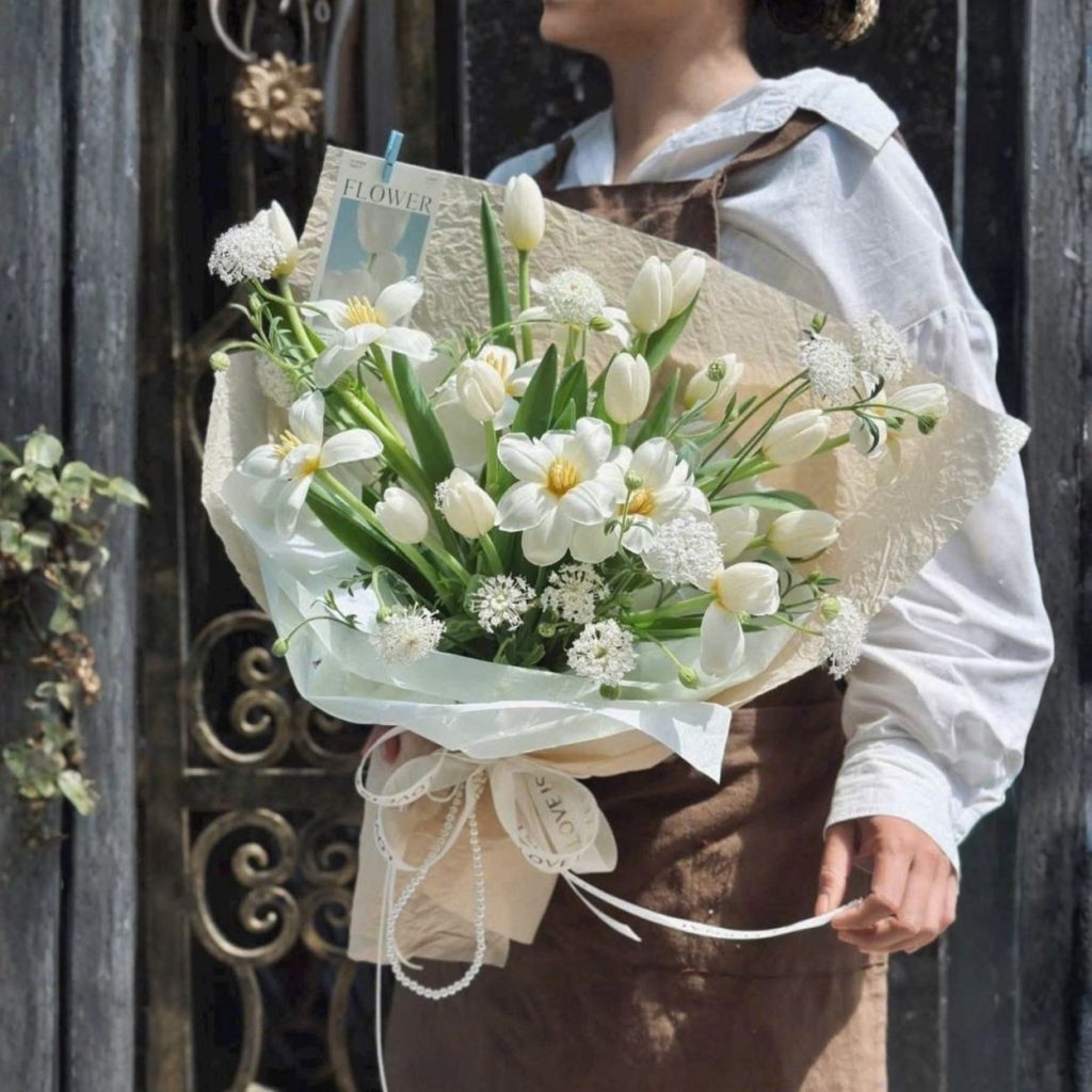 A boy là kiểu bó tối giản mà nhìn vô là thấy “đã”: nền trắng trong trẻo, đường nét gọn gàng, tinh thần thanh lịch nhưng không hề lạnh lẽo. Từ cánh tulip tròn mướt đến từng nhánh thúy châu li ti, mọi chi tiết đều được sắp đặt vừa đủ – đúng tinh thần “ít mà chất”. Đây là bó hoa dành cho người thích vẻ đẹp an yên, muốn nói điều gì đó thật mộc mạc mà vẫn đầy sức nặng cảm xúc.