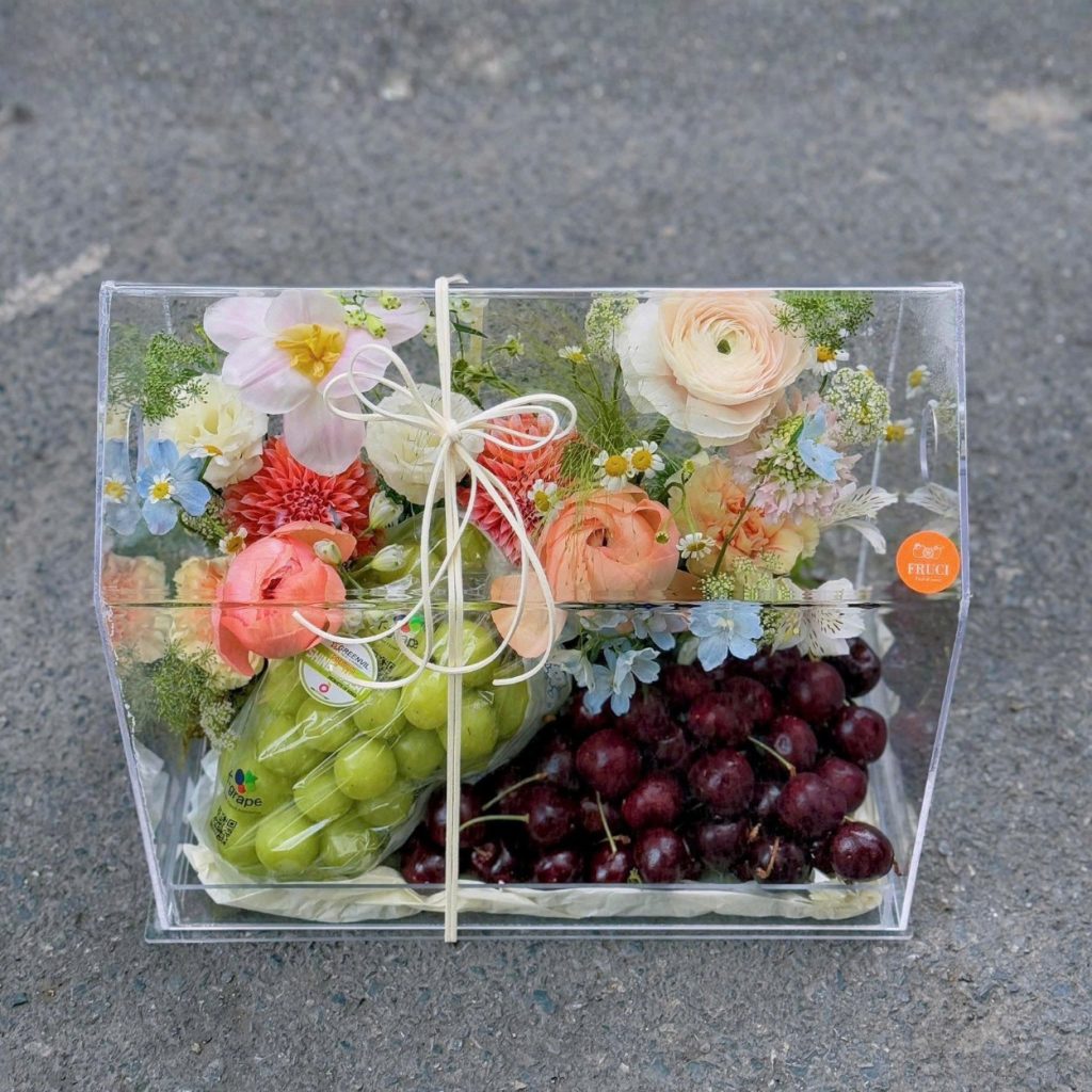 Tựa như một lời chúc lành đầu ngày, giỏ hoa trái cây Abracadabra mang đến cảm giác dịu dàng và rạng rỡ, như một phép màu nho nhỏ len vào cuộc sống. Sắc đỏ của cherry và tím than của nho đan xen giữa hoa tulip, cát tường và cúc tana tạo nên một bản hòa ca tươi sáng – vừa sang trọng, vừa gần gũi.