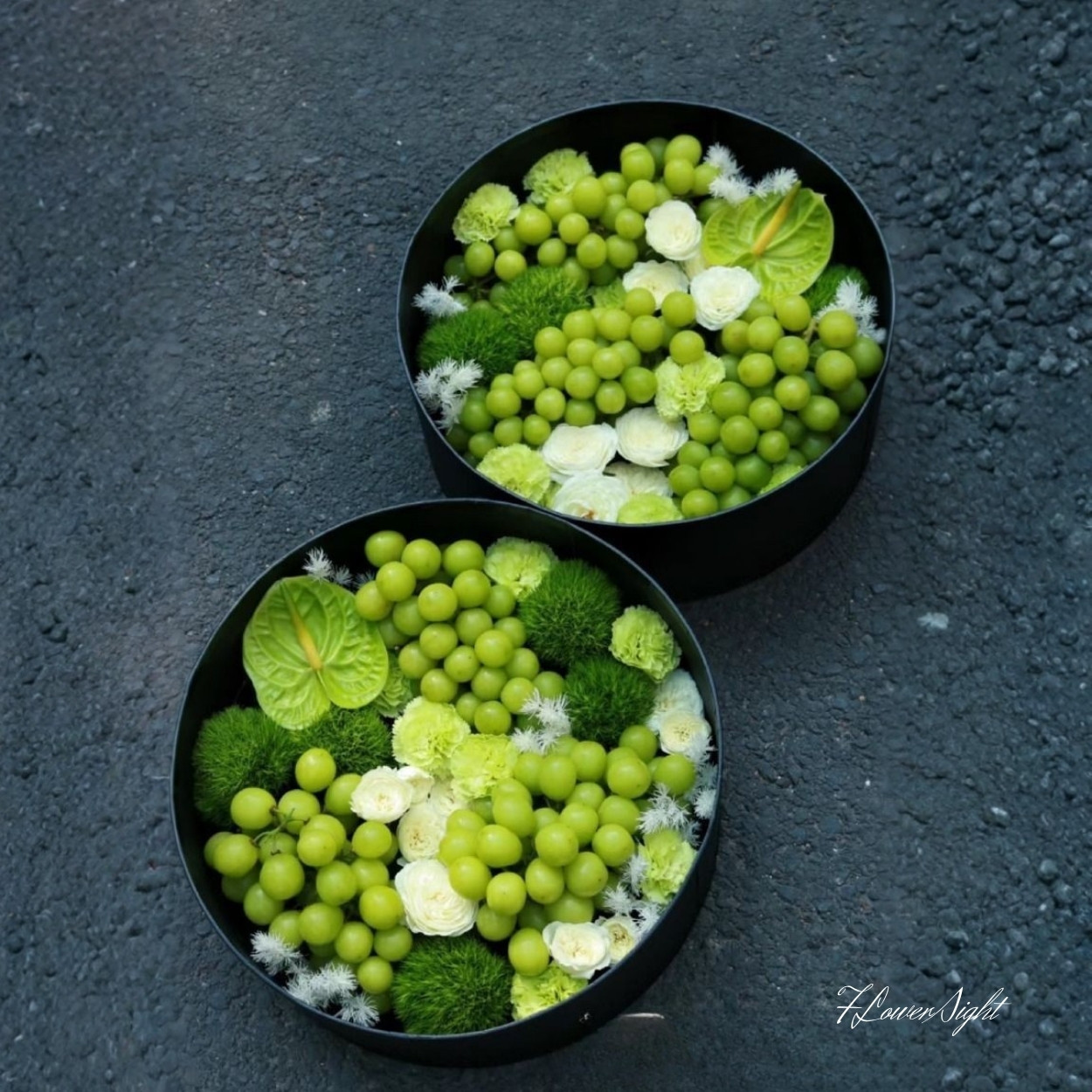Trái nho xanh là giống giòn ngọt, vỏ mịn, màu lục non bắt sáng rất tốt khi đặt trong hộp đen. Mao lương được chọn theo tiêu chí cánh dày, form tròn và sắc trắng ngà để tạo sự tương phản thanh lịch. Wicky trắng mang lại hiệu ứng bông mờ tựa sương, khiến tổng thể có chiều sâu. Lá môn xanh có bề mặt bóng, gân lá rõ, giúp kết cấu thêm khỏe khoắn. Toàn bộ được sắp xếp trong hộp tròn cứng cáp, thành cao vừa phải để giữ form mà vẫn khoe trọn mặt phối.