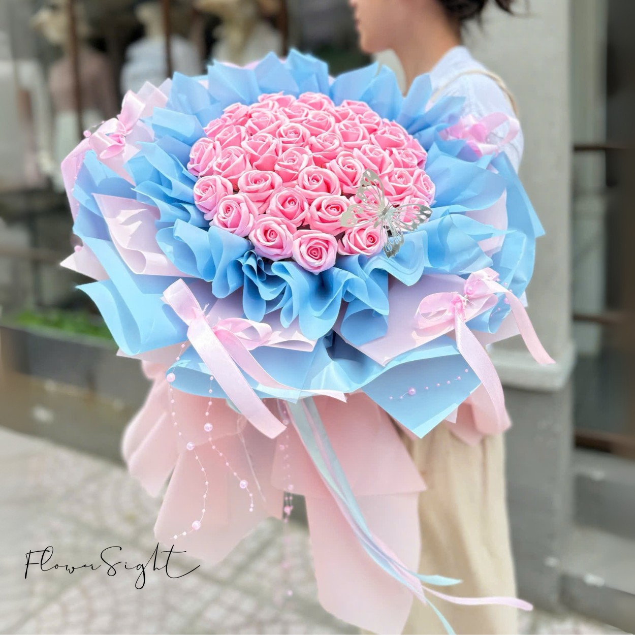 Lớp giấy gói hồng xen xanh không chỉ tạo nên sự hài hòa mà còn khéo léo tôn lên vẻ sang trọng. Bó hoa mang lại cảm giác như lời thì thầm của con tim, dịu dàng nhưng sâu sắc, khiến người nhận nhớ mãi.