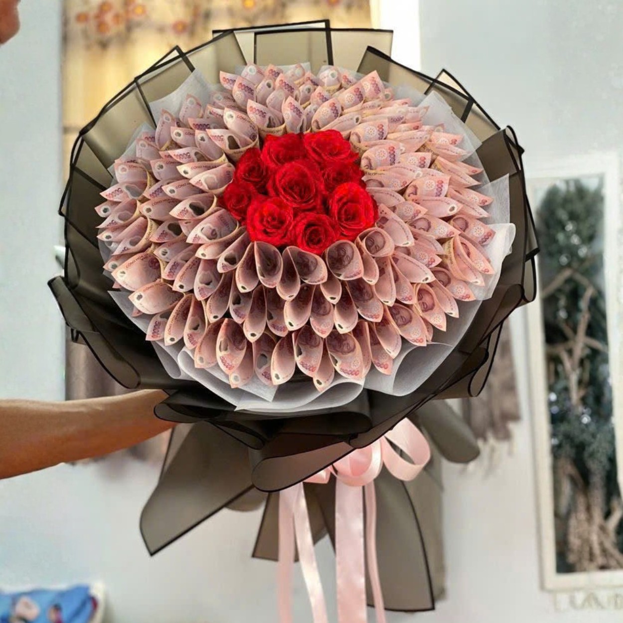 Trung tâm là cụm hoa hồng đỏ chọn bông tròn, cánh dày, được tôi cố định thành khối gọn. Bao quanh là nhiều lớp tiền 50k cuộn dạng cánh, miệng cánh thon, gót cánh khít, mép đồng trục để tạo vòng đều. Tôi sử dụng kỹ thuật giấu ghim, đường nối chìm, không làm ảnh hưởng giá trị tờ tiền, dễ tháo rời từng cánh khi cần. Lớp lót trắng giúp sắc tiền lên trong và sạch, lớp giấy đen mờ tạo viền khung, nâng chiều sâu như khung ảnh cho tác phẩm. Cuối cùng là dải nơ hồng satin, mềm và có độ phản quang nhẹ, hoàn thiện chất lãng mạn cho tổng thể.