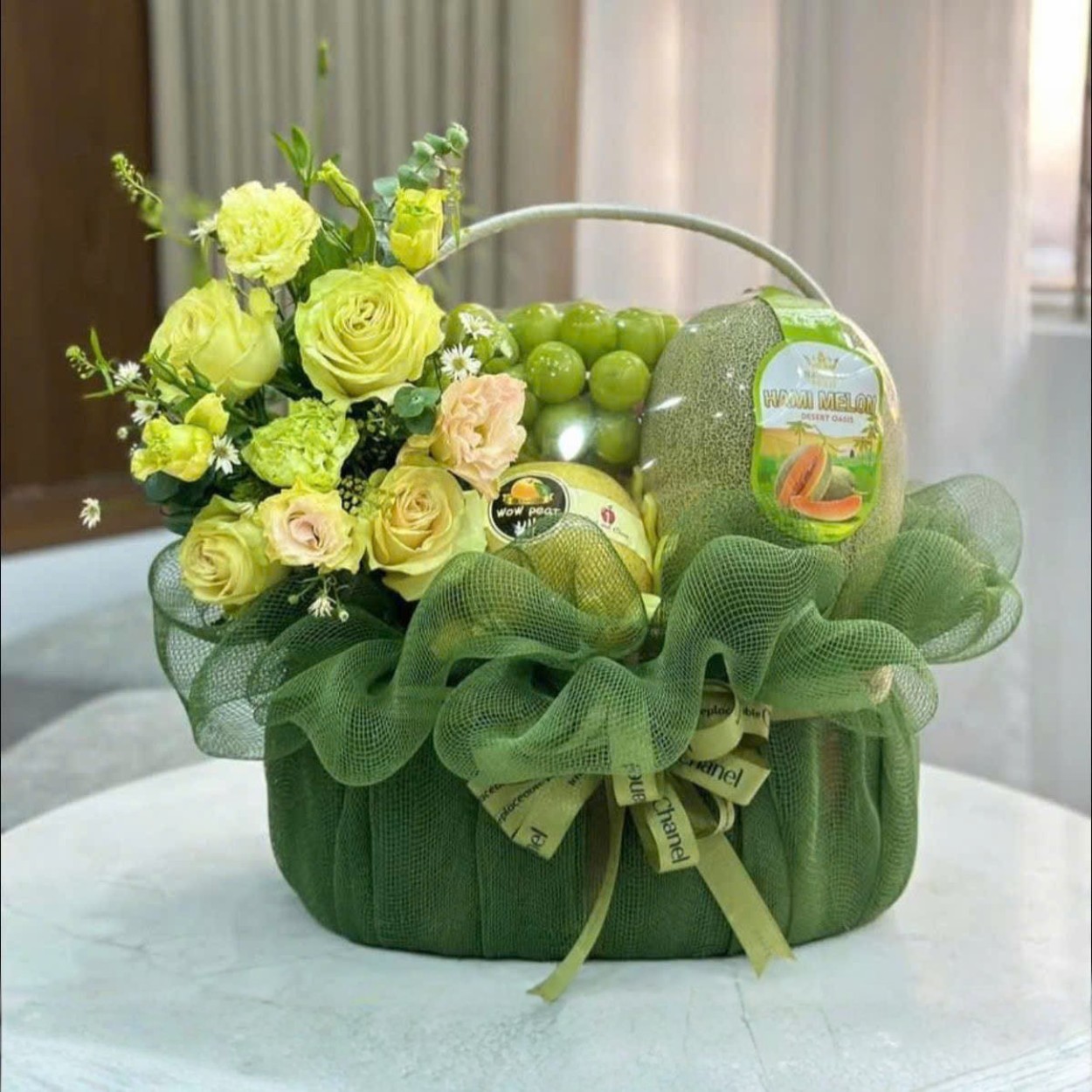 Bảng màu “xanh – kem – rêu” mang cảm giác mát mắt, hiện đại. Xanh nho và rêu của vải lưới gợi sự an lành, cân bằng; kem chanh của hoa hồng và cát tường làm điểm nhấn dịu, tươi, không chói; sắc bạc của lá giúp tổng thể có chiều sâu hơn. Khi đặt trên mặt bàn sáng, giỏ lên hình rất “fresh”: trái nổi, hoa mịn, ánh lưới bồng bềnh tạo hiệu ứng cao cấp mà vẫn gần gũi.