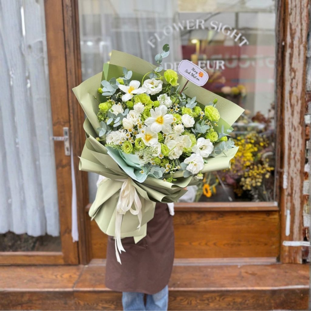 Giấy gói là sự pha trộn giữa olive trầm và xanh mint nhạt, bề mặt lì để giảm chói, tăng độ sang cho tông trắng của hoa. Lớp giấy trong cùng được “bevel” nhẹ, cho cảm giác nhiều lớp nhưng không cồng kềnh. Nơ lụa màu ngà thắt bản lớn, rủ dài để cân đối tỷ lệ bó. Nhờ lựa chọn chất liệu có độ giữ nếp tốt, bó giữ form đẹp trong suốt quá trình di chuyển và lên hình rất “clean”.