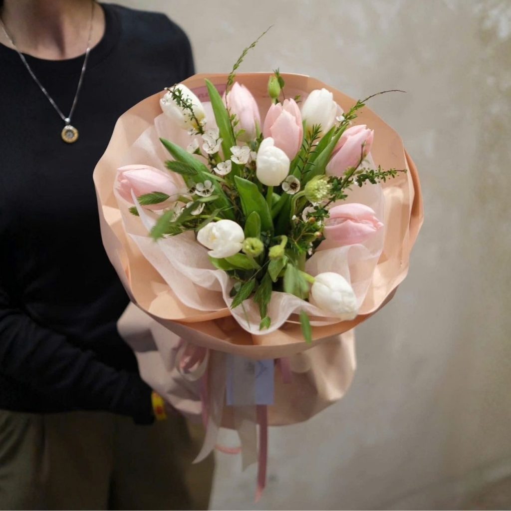 Ngay từ cái nhìn đầu tiên, “Anh vui” chinh phục bằng vẻ trong trẻo khó cưỡng: những búp tulip trắng sữa và hồng phấn đan xen, nương nhẹ trên nền giấy gói màu phấn đào, buộc bằng dải nơ lụa dịu dàng. Sắc độ sáng nhưng không chói, ấm mà vẫn nhẹ, như nụ cười hiền làm dịu cả ngày dài. Bó hoa này hướng đến cảm giác tinh tế và thân thiện, đặt người nhận ở trung tâm trải nghiệm với một tạo tác gọn ghẽ, dễ cầm, dễ yêu.