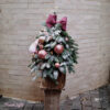 Chiếc cây thông được thiết kế như một khung cảnh thu nhỏ của Giáng sinh truyền thống: lá thông xanh đậm, quả thông khô tự nhiên, những trái châu ánh vàng và nơ lụa điểm xuyến nhẹ nhàng trên nền chậu gỗ rustic. Mọi chi tiết được sắp đặt tỉ mỉ để gợi nên cảm giác an yên, gần gũi – như thể bạn đang lạc vào một thế giới khác, nơi thời gian trôi chậm lại giữa sắc xanh của mùa lễ hội.