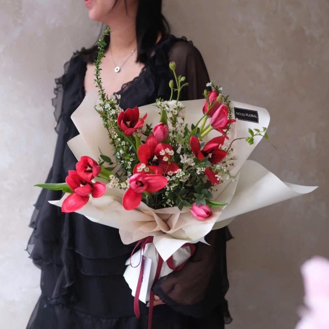 Sapo: “Antaram” được tạo nên để nói thay lời trái tim – một bó hoa tulip đỏ ánh ruby, nổi bật giữa nền giấy kem dịu và đường nét xanh mướt của lá. Sự đối thoại giữa sắc đỏ nồng ấm, điểm trắng tinh khôi của sao trắng – tuyết mai và chiếc nơ màu rượu vang giúp tổng thể vừa thanh lịch vừa dứt khoát. Không phụ thuộc vào lời quảng cáo, “Antaram” chạm cảm xúc bằng bố cục chuẩn mực, chất liệu đẹp và tay nghề cắm tỉ mỉ, khiến khoảnh khắc trao – nhận trở nên đầy ý nghĩa.