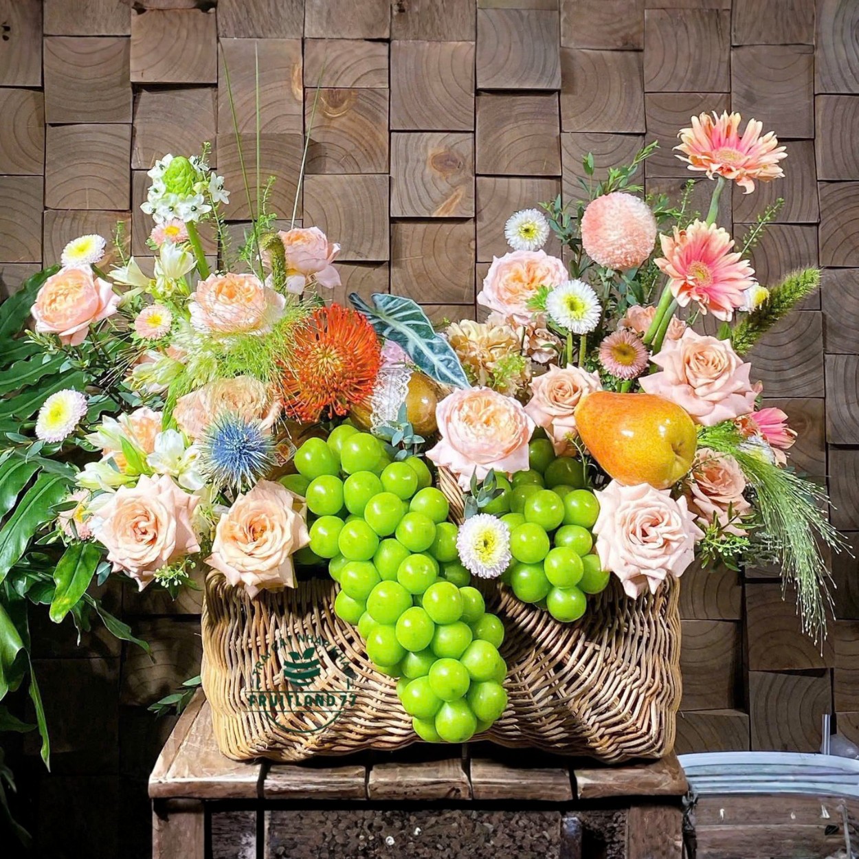 “Barcelona” được dựng trên giỏ mây bản lớn, nan thưa, tạo cảm giác gần gũi nhưng vẫn rất chỉn chu. Trái cây là “linh hồn” của tổng thể: chùm nho xanh hạ độ cao theo dáng thác, khối táo sáng bóng kê làm trụ điểm nhìn. Hai bên là cụm hoa được tỏa rộng theo vòng cung, giữ khoảng thở ở chính giữa để mắt người nhìn luôn quay về cụm trái cây trung tâm. Lá phụ bản to – nhỏ (monstera, dương xỉ, cỏ đuôi chồn…) đệm nền, giúp khối hoa dựng chắc nhưng không nặng nề.