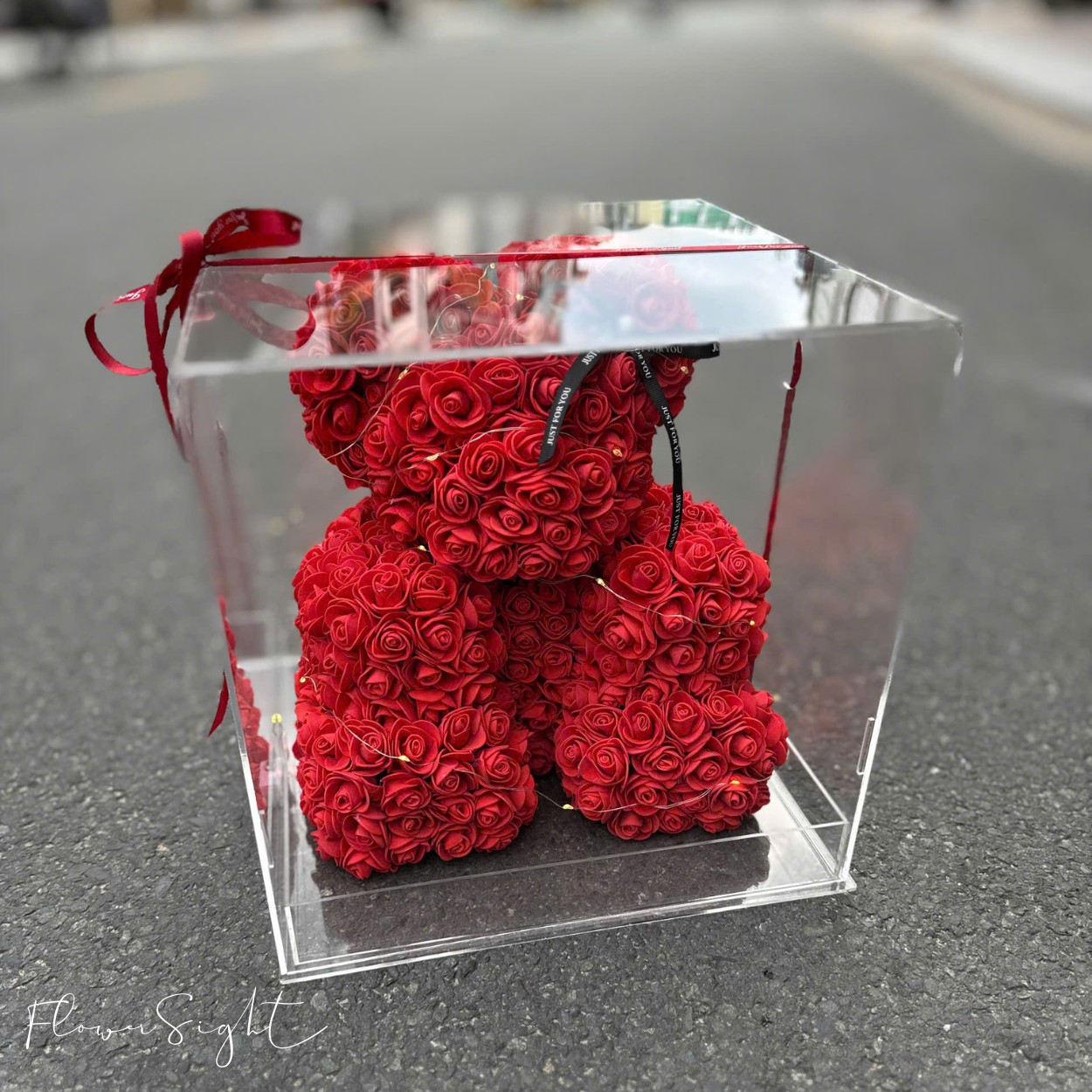 Bất Ngờ gây ấn tượng ngay từ cái nhìn đầu tiên với sắc đỏ nồng nàn của hoa hồng, biểu tượng của tình yêu và đam mê. Hộp nhựa trong sáng giúp tôn lên vẻ đẹp từng cánh hoa, đồng thời tạo cảm giác hiện đại và trang nhã. Dây nơ đen và đỏ được buộc khéo léo, làm nổi bật sự hài hòa giữa các chi tiết, khiến tổng thể vừa tinh tế vừa đầy sức hút.