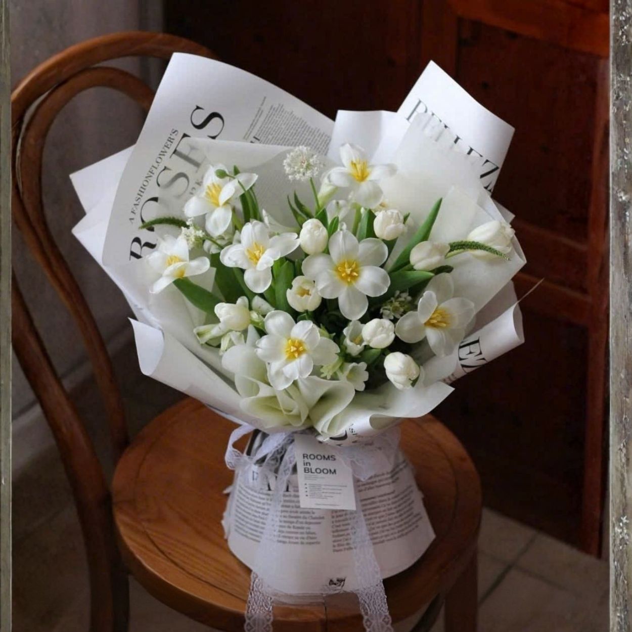 Giấy gói chọn tông trắng pha họa tiết chữ in nền nhẹ, ôm thành nhiều lớp xòe tự nhiên. Lớp voan bán trong sắp ở giữa và ngoài cùng, tạo hiệu ứng mờ mịn như một làn khói sương. Dáng bó tròn hướng lên, chân bó bọc kỹ để giữ phom. Nơ ren trắng buộc hai vòng, rủ dài, vừa làm điểm nhấn vừa khiến phần chân thanh thoát. Khi cầm trên tay,