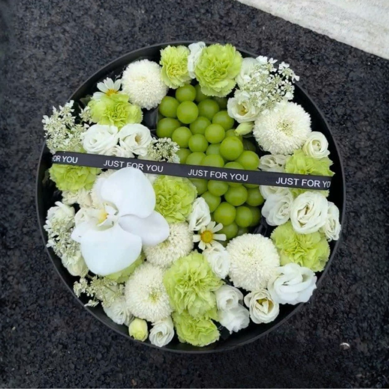 Một thiết kế được “đo ni đóng giày” cho người chuộng vẻ đẹp tinh gọn: Bloodstone chạm vào cảm giác đầu tiên bằng tông trắng – lục mát mắt, đặt trong hộp tròn đen lịch lãm. Ở trung tâm là chùm nho xanh căng mọng như viên ngọc tươi, xung quanh là vòng hoa trắng – xanh được xếp lớp mềm mại. Tất cả tạo nên bố cục vòng tròn hoàn chỉnh: nhìn yên bình, chạm sang trọng, trao tay là ưng ý.