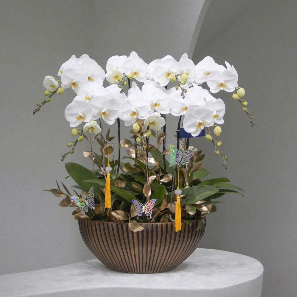 Món quà mang ý nghĩa chúc mừng khởi đầu mới, phù hợp với cửa hàng nhỏ nhờ Chậu Lan Hồ Điệp Trắng đại diện cho sự thịnh vượng. Lá chanh và khánh treo tăng vẻ đẹp, thu hút tài lộc theo phong thủy, giúp chủ cửa hàng cảm nhận sự may mắn từ ngày đầu.