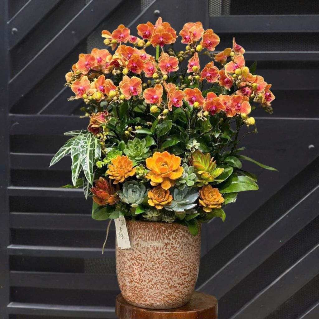 Lan hồ điệp màu cam là tâm điểm của chậu hoa. Màu cam tượng trưng cho năng lượng, sự tự tin và lời chúc thành công. Bên cạnh đó, sen đá với hai tông màu – cam và xanh – giúp cân bằng sắc thái và mang lại cảm giác tươi mới.