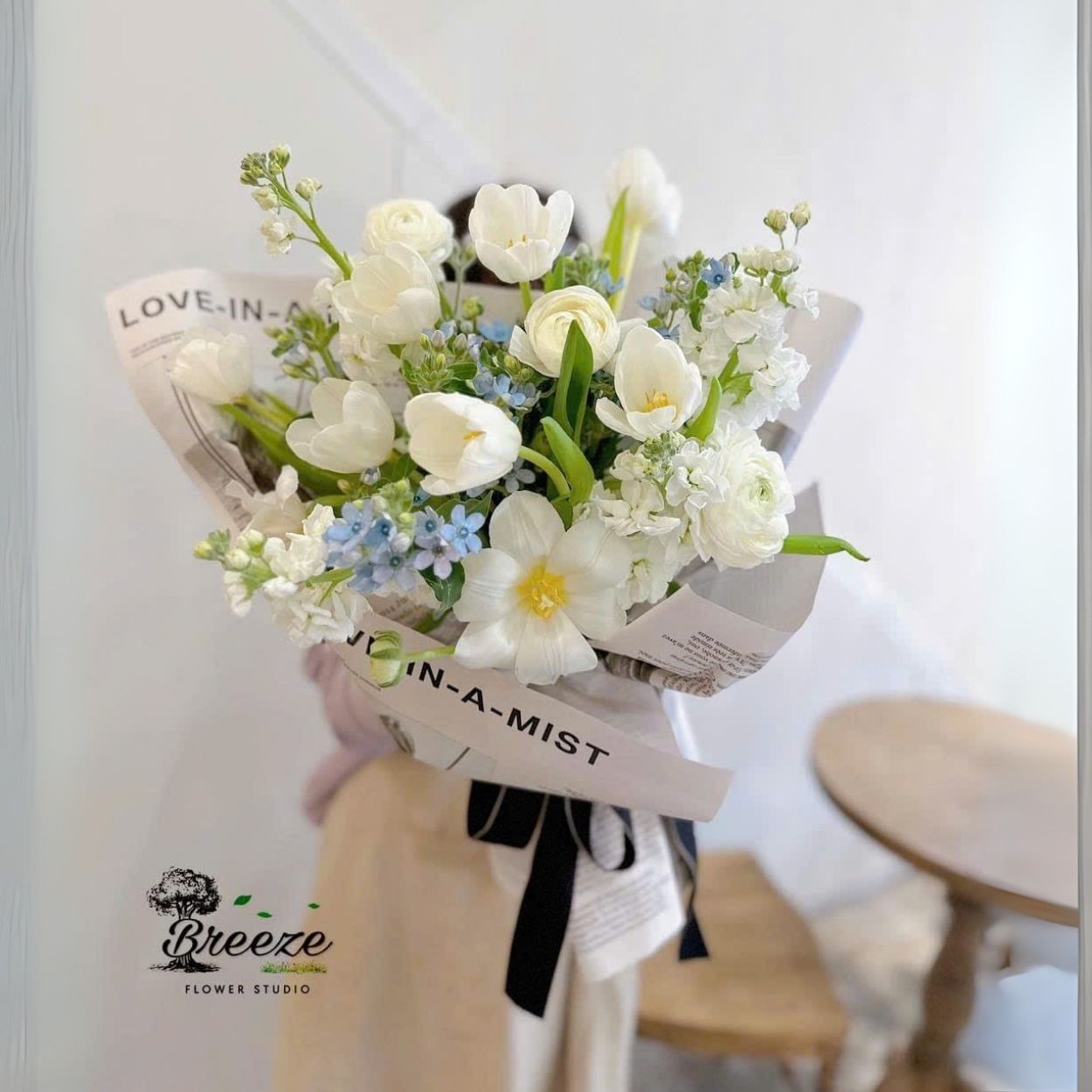 Nếu bạn đang tìm một bó hoa nói hộ câu “tôi tinh tế nhưng không phô trương”, Caryln chính là câu trả lời. Toàn bộ tông trắng – xanh dịu mắt được sắp đặt theo lối air–dome thoáng nhẹ: tulip trắng nụ – nở đan xen tạo nhịp điệu, mao lương với lớp cánh xếp tầng như lụa, sao xanh bé xíu sáng lên như những đốm trời, phi yến vươn khẽ để kéo chiều cao, tất cả đặt trên nền giấy gói phong cách báo và nơ đen tối giản. Nhìn gần, Caryln mộc mạc; nhìn xa, Caryln sang.