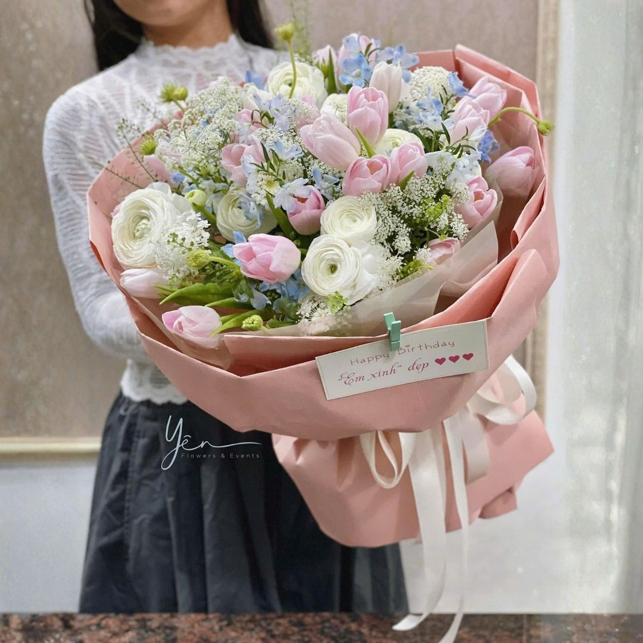Tulip tượng trưng cho tình yêu chân thành và lòng biết ơn, là loài hoa của sự thanh lịch. Mao lương với những lớp cánh mỏng manh xếp chồng lại tượng trưng cho sự tinh tế và dịu dàng trong tâm hồn. Thúy châu xanh điểm nhẹ như những giọt sương ban mai, mang lại cảm giác tươi mát, trong khi hoa cà rốt nhỏ xinh tạo nên nét hoang dã và tự nhiên, khiến bó hoa thêm phần phóng khoáng.