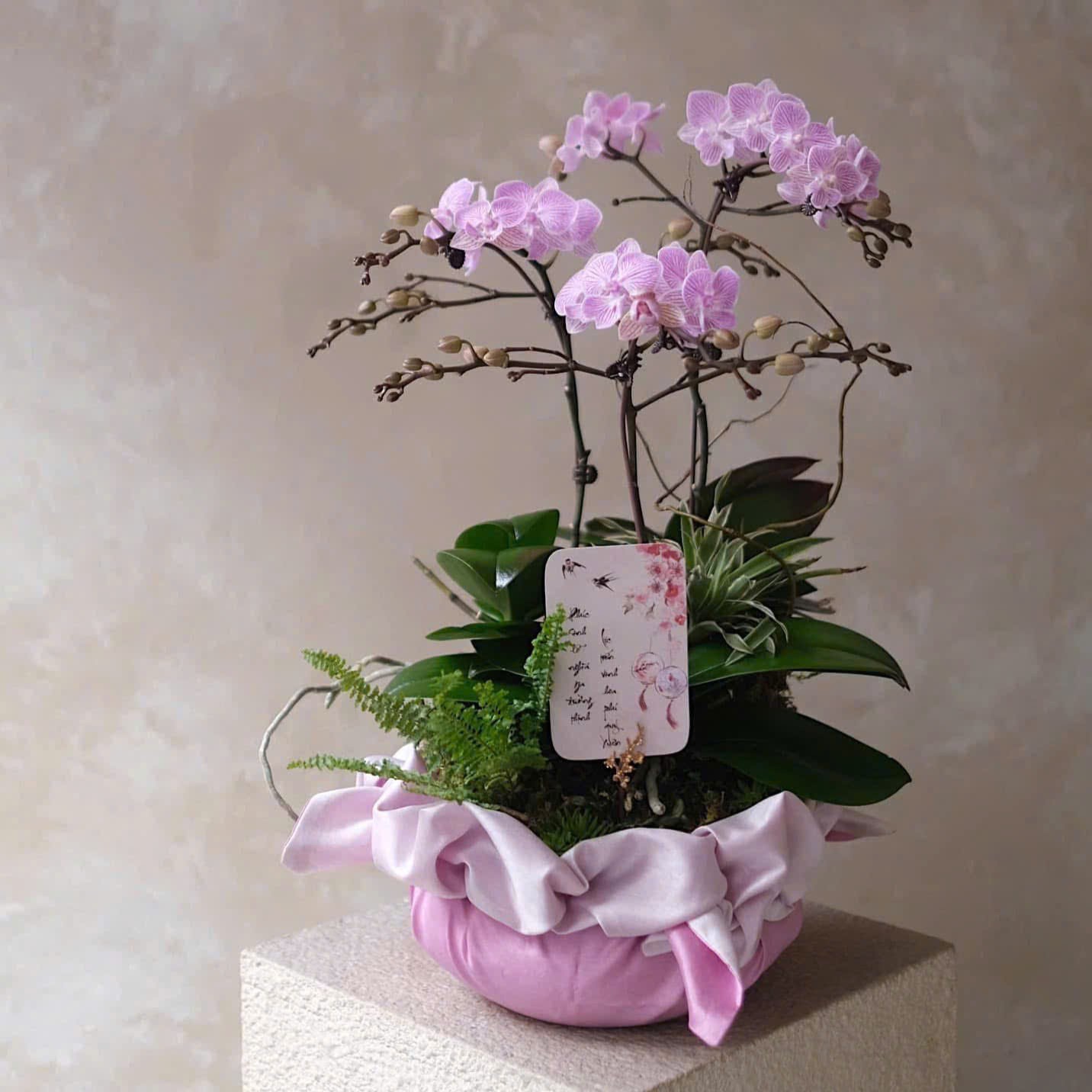 My Juliet sở hữu phong cách thiết kế sang trọng nhưng vẫn giữ được sự mềm mại đầy nữ tính. Những cánh lan hồ điệp hồng khoe sắc nhẹ nhàng, hòa quyện với dương sỉ mềm và lá sọc, tạo cảm giác tươi mới và tràn đầy sức sống. Lớp vải lụa tơ tằm bao bọc tinh tế, tôn lên vẻ đẹp thanh lịch và làm nổi bật từng đường nét của chậu hoa.