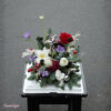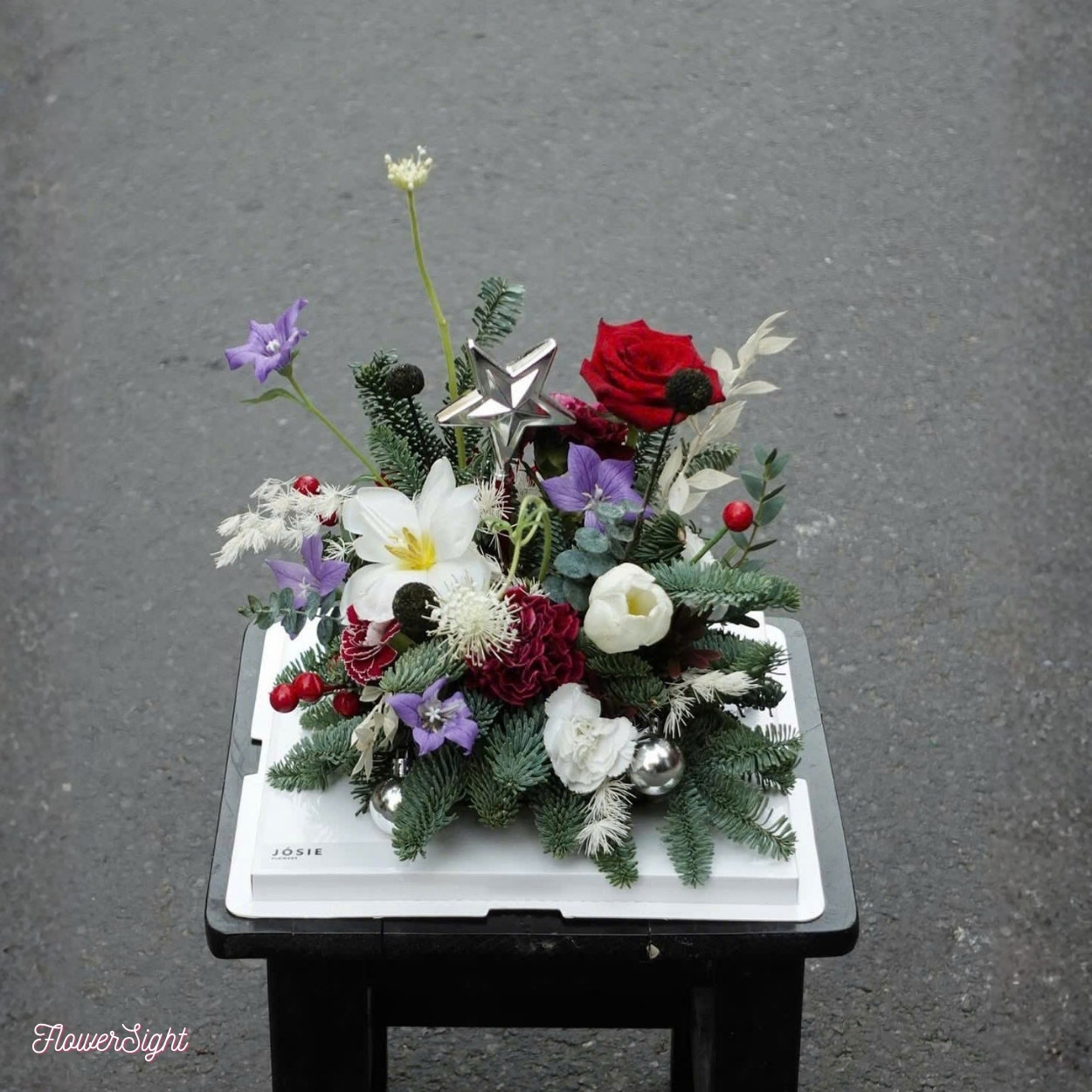 Có những khoảnh khắc Giáng Sinh không cần thật lớn, chỉ cần một “điểm sáng” tinh gọn mà đủ ấm lòng. Chiara được tạo nên cho cảm giác đó: một cây thông Noel tươi phiên bản bàn/console, thấp vừa vặn, tỷ lệ cô đọng, đem sắc xanh rừng thông bước vào không gian sống. Trên nền hộp tối giản, lớp cành thông được xếp đan xen nhiều tầng, mở ra bề mặt mềm mại như tán tuyết. Ở trung tâm, nhịp màu dẫn dắt từ đỏ nhung của hoa hồng, sang trắng ngà của tulip, rồi lấp lánh ánh kim từ chuỗi ngọc trang trí và nhánh lá bạc. Tổng thể thanh lịch, hiện đại, không khoa trương nhưng bắt mắt ngay từ lần chạm nhìn đầu tiên.