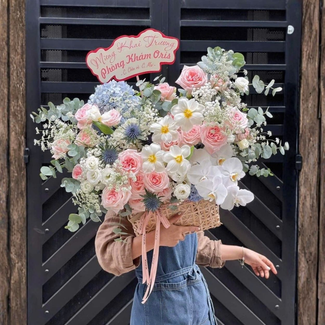 Giỏ có độ rộng thoáng, mặt hoa phủ đều nhưng vẫn chừa khoảng thở để mỗi bông có “không gian riêng” khi lên ảnh. Hương thơm dịu chủ yếu từ hoa hồng và cát tường, không gắt, phù hợp đặt gần khu vực tiếp khách hoặc bàn làm việc. Tổng trọng lượng được tối ưu để cầm tay chắc chắn; phần chân cắm được xử lý chống rò nước, an tâm khi đặt trên mặt gỗ. Kèm theo thẻ lời nhắn nhỏ gọn, chất liệu giấy dày, mực không lem khi viết bút máy.