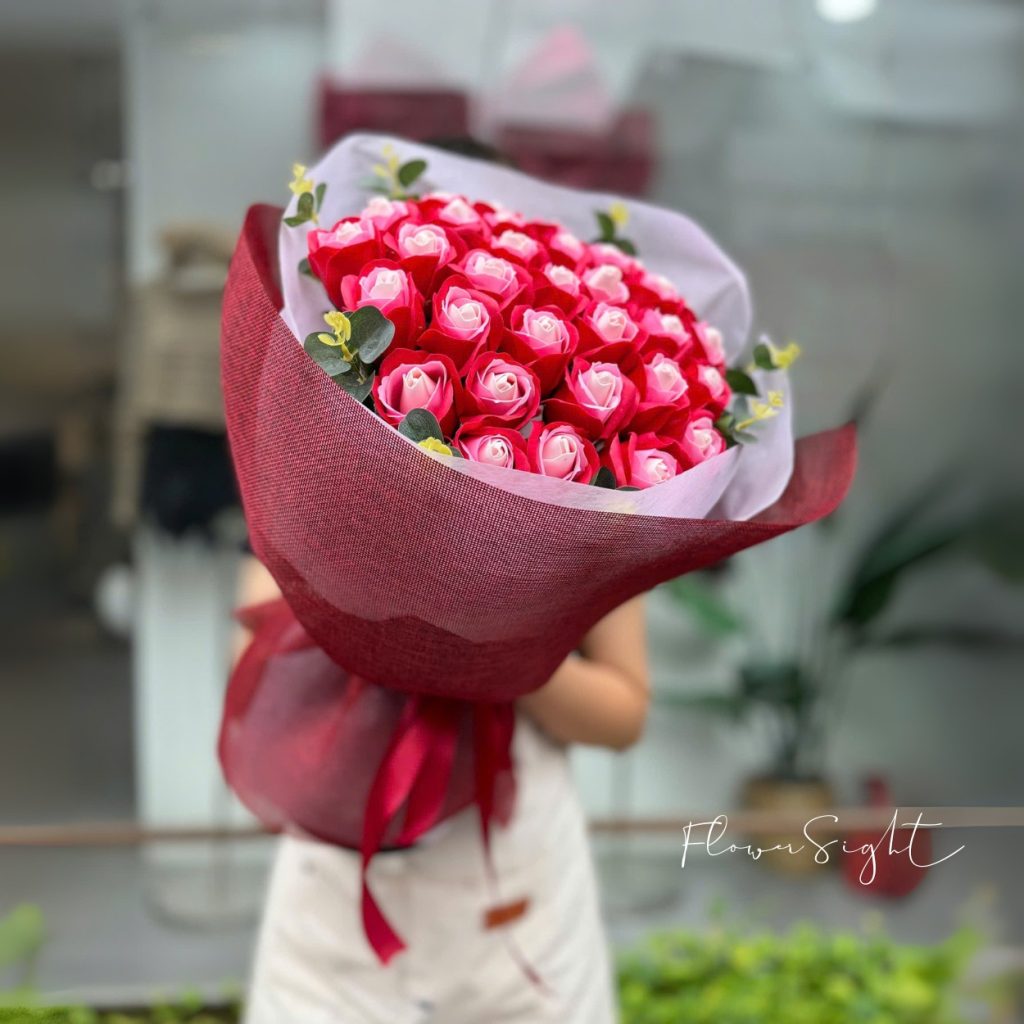 Ngay khi mở lớp giấy, bạn sẽ thấy một bầu trời đỏ hồng đang nở rộ. Chung Đôi lấy cảm hứng từ hành trình hai sắc độ song hành, đỏ đằm thắm tan vào hồng dịu nhẹ. Hiệu ứng chuyển sắc mịn như son, tạo nên mặt hoa tròn đều và đầy đặn. Chỉ cần nghiêng bó hoa dưới ánh sáng, từng cánh sáp sẽ bắt sáng dịu, cảm giác như khối màu đang thở. Bao quanh cụm hoa là vải bố đỏ dày dặn, chất liệu mộc mạc nhưng không kém phần sang, tạo phông nền sâu giúp tông đỏ hồng nổi bật hơn. Vài nhánh lá bạc xen kẽ đúng chỗ, làm nhiệm vụ nhấn nhá và mở khoảng thở cho bố cục. Tổng thể tối giản, hiện đại và tinh tế.