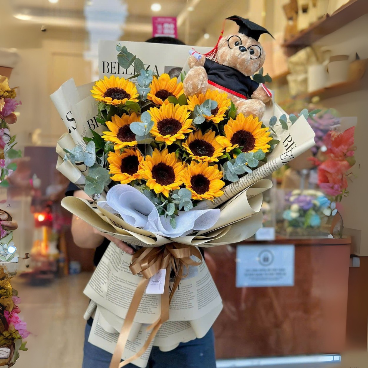 Bó hoa gấu này thích hợp làm quà tặng vợ trong những dịp sinh nhật hoặc kỷ niệm. Gấu bông mini kết hợp hoa hướng dương và lá phụ xanh tạo tổng thể vừa dễ thương vừa sang trọng, giúp món quà trở nên ý nghĩa và ghi dấu khoảnh khắc tình cảm quý giá.