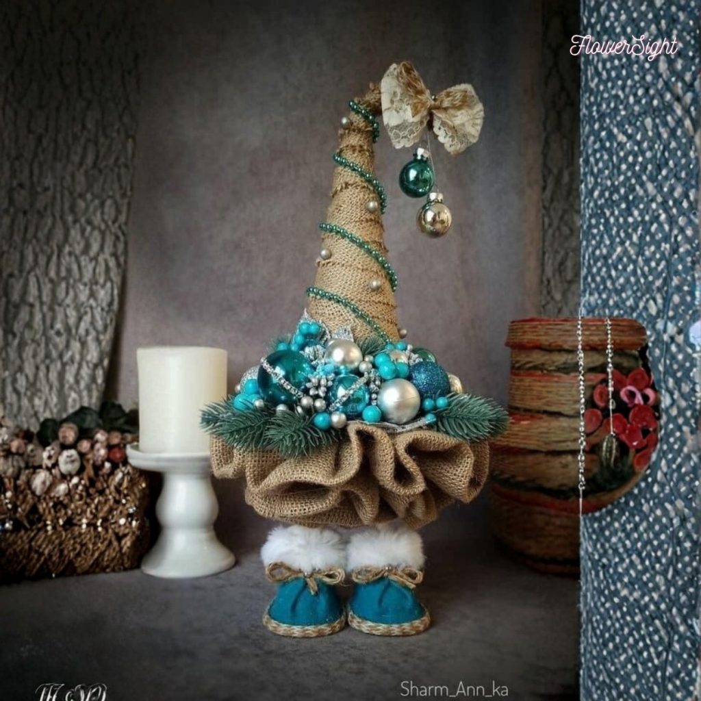 Phần chân váy xếp nếp từ vải bố nâu nhạt kết hợp cùng lá thông tươi xanh mang đến cảm giác ấm áp, gần gũi. Đôi giày nhỏ màu xanh biển cùng lớp lông trắng mềm mại phía dưới lại khiến tổng thể thêm phần duyên dáng – như một nhân vật Giáng sinh nhỏ bé đang mỉm cười giữa trời đông.