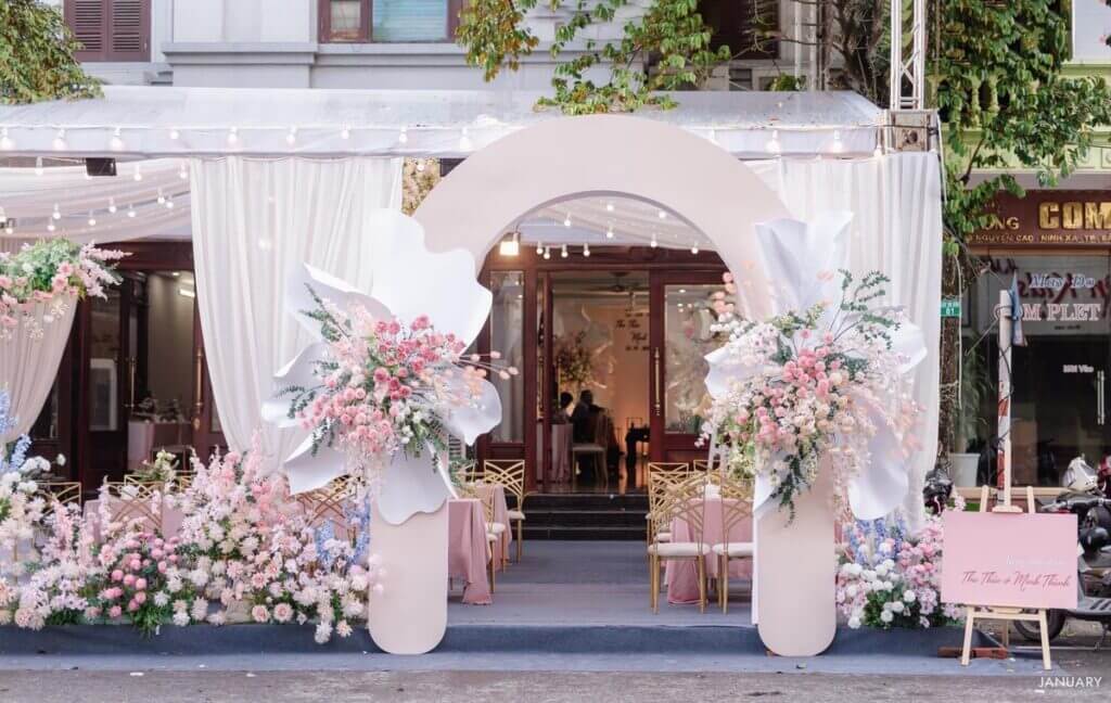 Bên cạnh đó, cổng hoa cưới màu hồng còn được xem là biểu tượng về một tình yêu thuần khiết, nhẹ nhàng nhưng bền lâu, cùng đi bên nhau đến hết cuộc đời. Cánh cổng màu hồng cũng tượng trưng cho cuộc sống sau hôn nhân, là thông điệp về niềm hy vọng hạnh phúc tràn ngập trong ngày trọng đại của cô dâu chú rể.