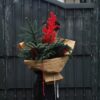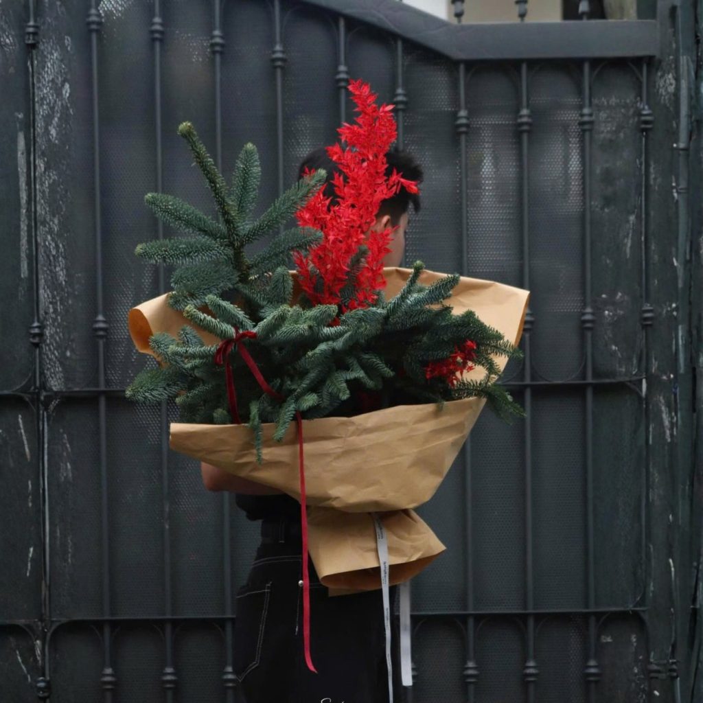 Bó hoa này gây ấn tượng ngay từ cái nhìn đầu tiên nhờ phom dáng phóng khoáng: lớp giấy craft nâu gói rộng tự nhiên, ôm trọn cụm lá thông xanh đậm vươn tán mạnh mẽ. Xen kẽ giữa những nhánh lá là cụm lá chanh Ý và điểm nhấn đỏ rực nổi bật, tạo nên sự tương phản rất “mùa lễ hội”, khiến bố cục trở nên sâu và giàu cảm xúc hơn. Một dải ruy băng đỏ thả dài như đường nét trang trí đậm chất Giáng sinh, khiến tổng thể vừa giản dị, vừa tinh tế.