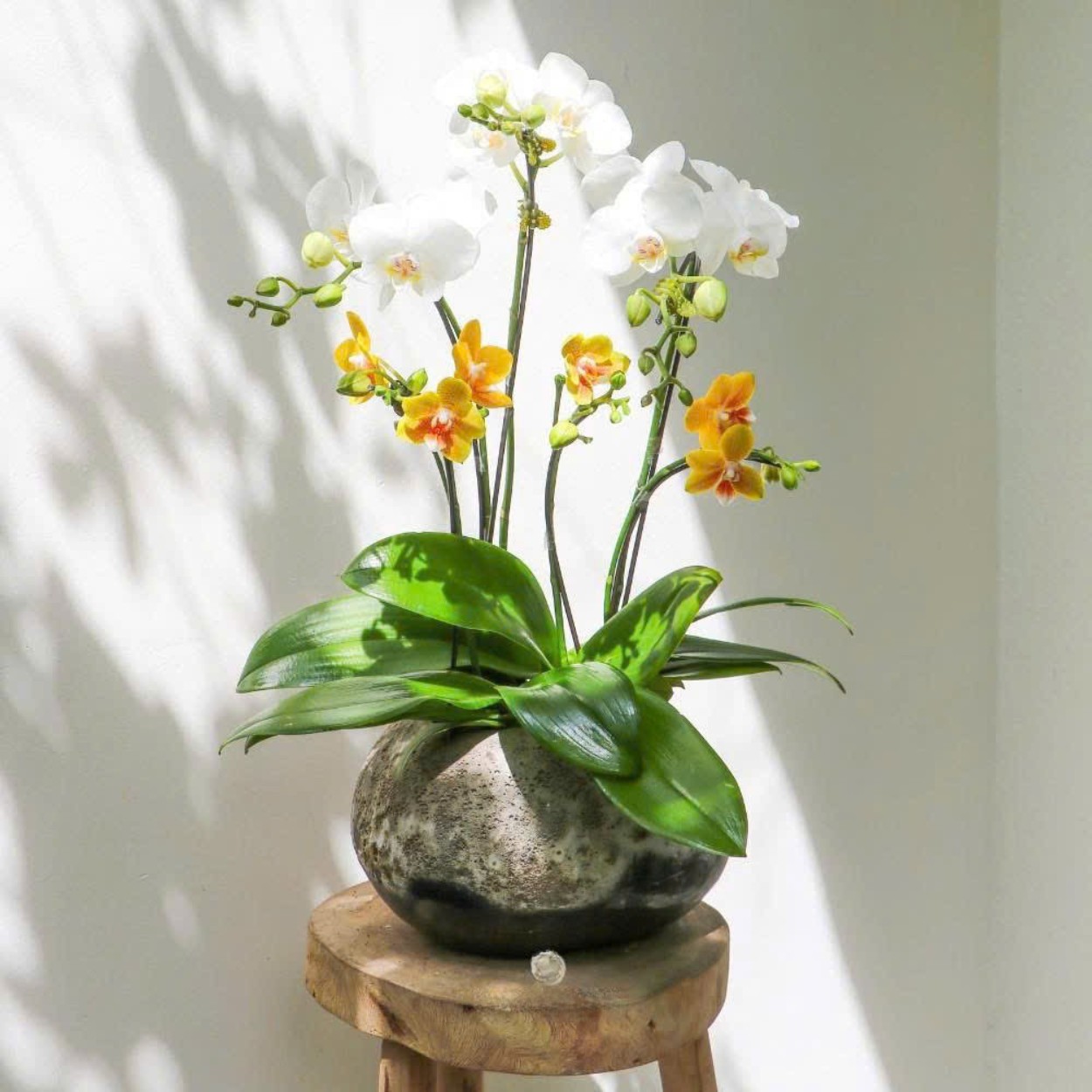 Chậu hoa dễ chăm sóc, thích hợp đặt bàn làm việc, phòng khách hay góc học tập. Nên tưới nước vừa đủ và tránh ánh nắng trực tiếp để hoa luôn tươi mới. Chậu hoa vừa bảo vệ lan vừa tăng vẻ sang trọng, giúp món quà giữ được lâu.