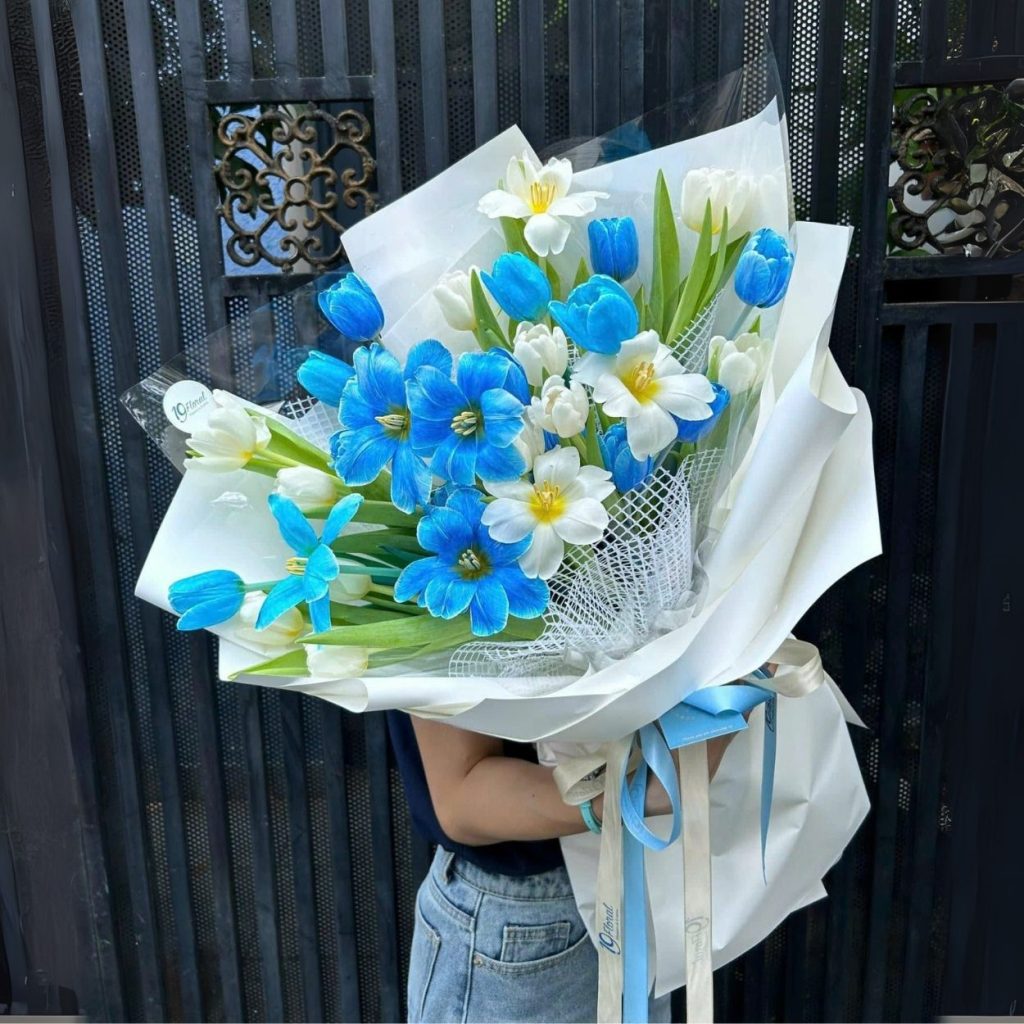 Mở bó hoa ra là một làn gió mát. “Cty for me” chọn ngôn ngữ xanh – trắng làm chủ đạo: những đoá tulip lam biển nổi bật xen kẽ tulip trắng ngà, tạo nhịp điệu sáng – tối rõ ràng như bản giao hưởng đầu ngày. Kiểu cắm thoáng, hướng bông vươn cao tự nhiên, để thân lá tulip dài và mềm vẫn giữ được độ cong duyên dáng. Toàn bộ được ôm trong lớp giấy gói trắng tinh giản, phối nơ lụa xanh pastel và trắng đồng điệu – một tinh thần minimal nhưng không hề lạnh, trái lại rất “đời” và gần gũi.