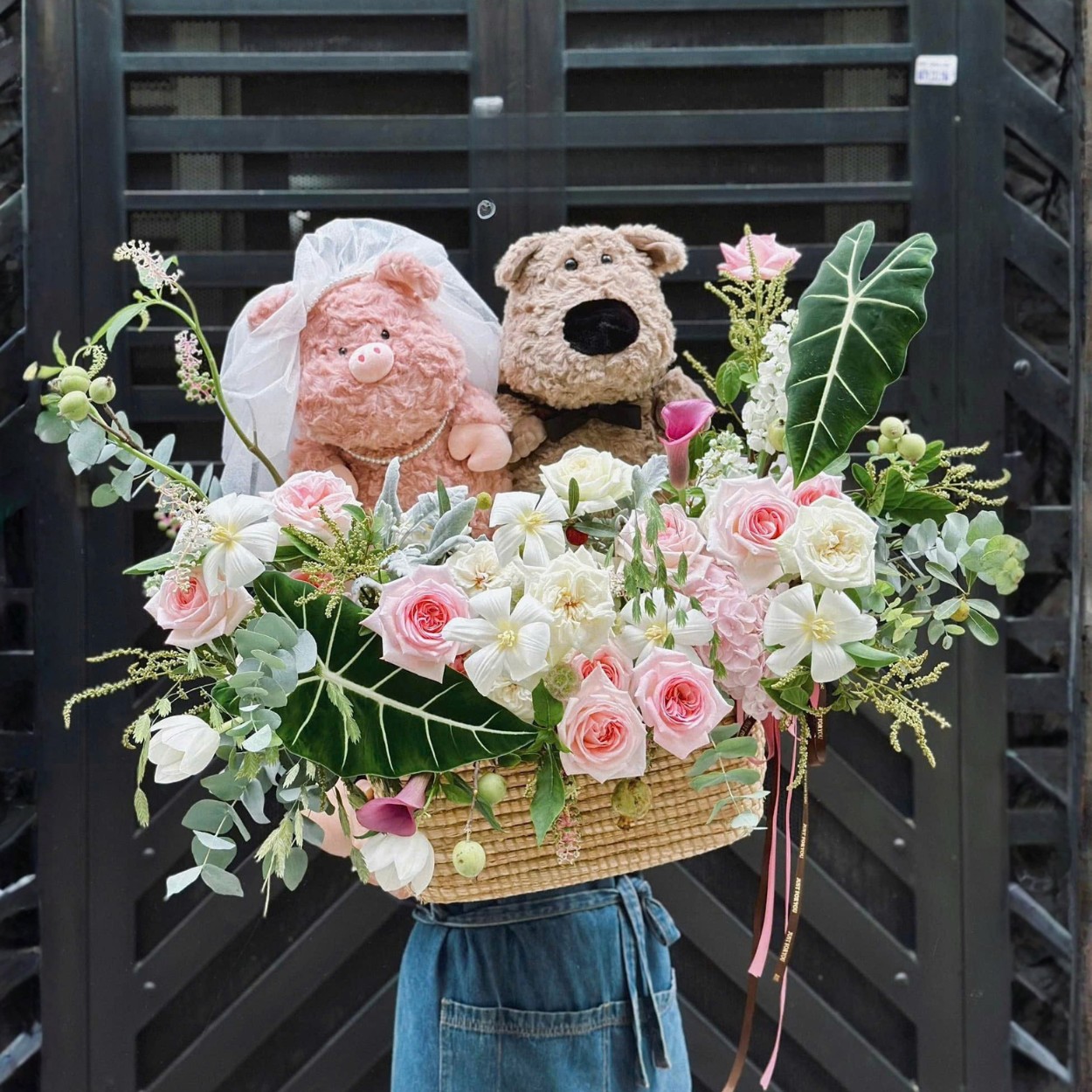 Tôi đặt tên “Đặc Biệt” vì ngay từ ánh nhìn đầu tiên, bố cục đã tạo cảm giác dịu mà sâu. Trung tâm là gấu bông êm ái như lời mời ôm, đứng cạnh cụm hồng O’Hara cánh dày mịn. Từng cánh hồng O’Hara bung lớp như lụa, chuyển sắc hồng ấm sang kem phớt rất tự nhiên. Tú cầu hồng nở tròn ở lớp nền nâng chiều sâu tổng thể, còn tulip vươn thẳng nhẹ làm đường dẫn cho ánh nhìn. Hồng môn bề mặt bóng quyện cùng những chiếc lá trái tim xanh mướt, tạo độ tương phản chất liệu giữa mịn lì và bóng ánh. Cỏ đồng tiền rải lấm tấm như điểm sáng nhỏ, khiến bó hoa sống động mà không bị rối.