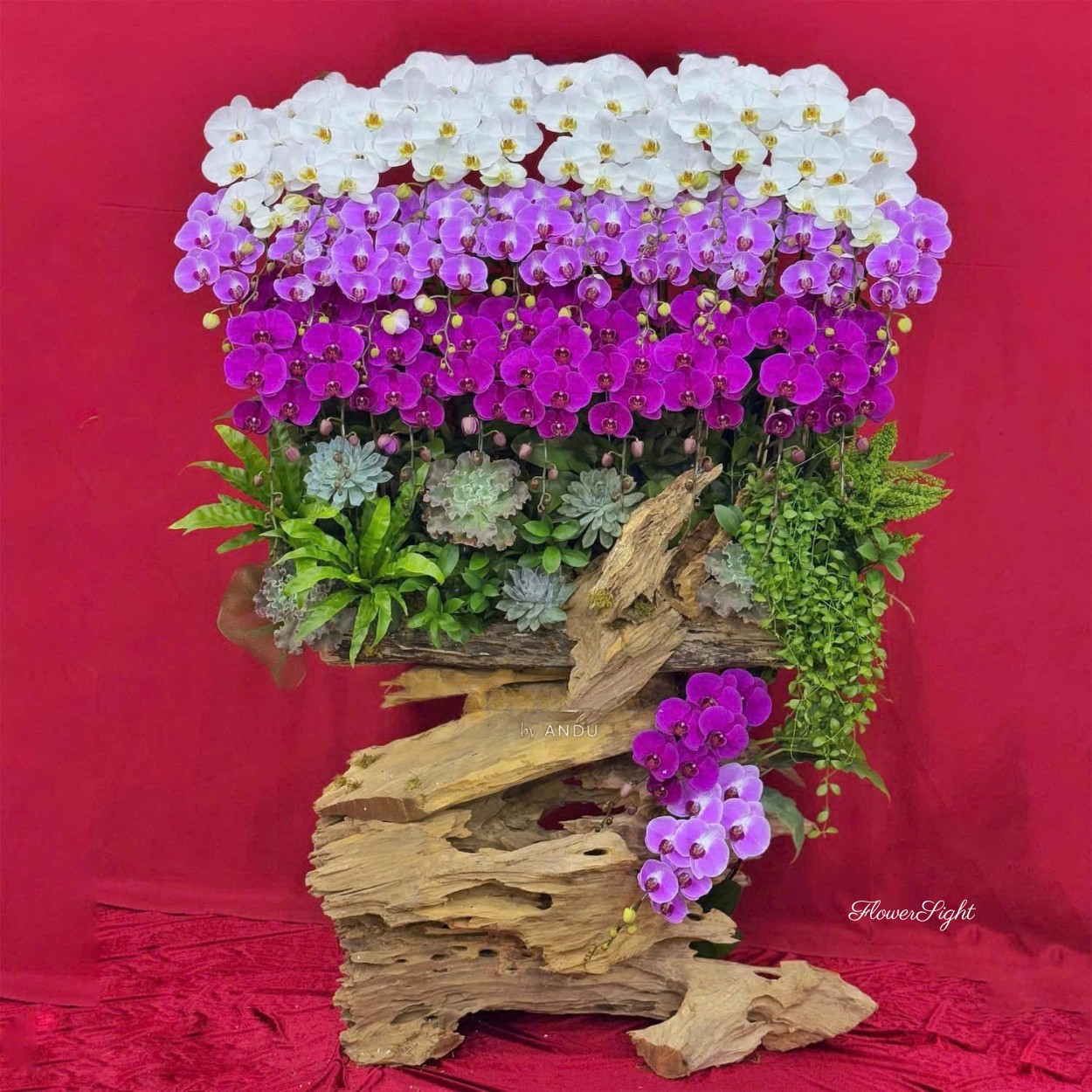 Dạt dào biển khơi là lựa chọn hoàn hảo để gửi gắm lời chúc may mắn và thành công. Hoa lan kết hợp lan điệp đại, sen đá, dây rủ và thân gỗ tạo nên vẻ đẹp thanh lịch, phù hợp tặng tân gia, khai trương văn phòng hoặc bố mẹ dịp kỉ niệm đám cưới.