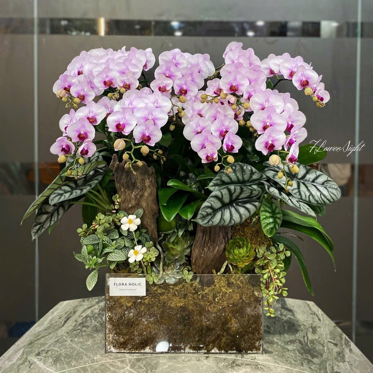 Điều bất ngờ mang vẻ đẹp tinh tế, hài hòa nhưng vẫn nổi bật, thể hiện niềm vui và lời chúc ý nghĩa. Sự kết hợp từ chậu lan hồ điệp 6 cành, sen đá, dây thường xuân, lũa và hoa gỗ tạo nên tổng thể vừa sang trọng vừa gần gũi. Sắc hoa rực rỡ cùng màu lá nhã nhặn khiến không gian thêm sinh động, đồng thời làm nổi bật thông điệp bất ngờ và vui vẻ dành cho người nhận.