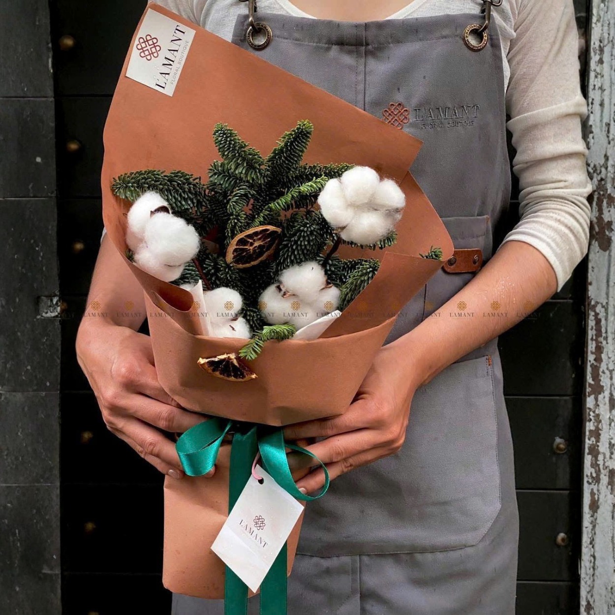 “Distance” là mẫu bó hoa Noel được tạo ra từ những chất liệu mang đậm hơi thở mùa đông: lá thông xanh trầm, bông gòn trắng mềm mịn và lát cam sấy mang sắc nâu cam ấm áp. Không cầu kỳ, không rực rỡ, bó hoa thu hút bằng sự giản đơn nhưng có chiều sâu – giống như vẻ đẹp lặng lẽ của mùa lạnh, khi mọi chi tiết đều trở nên rõ ràng và tinh khiết hơn.