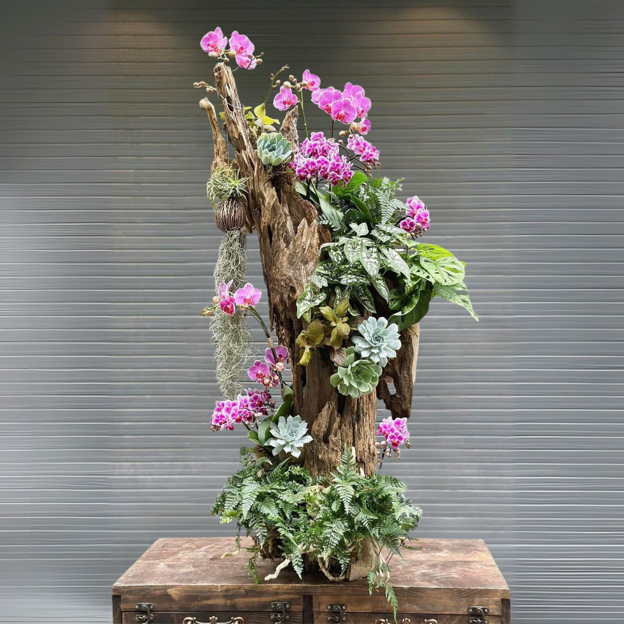 Chậu hoa sử dụng tiểu hồ điệp – loài lan mang nét đẹp nhỏ nhắn, thanh thoát nhưng vẫn kiêu sa – như đại diện cho những mối quan hệ sâu sắc, những yêu thương chân thành. Gỗ lũa và sắc xanh của dương xỉ tạo nên tổng thể mộc mạc, gần gũi nhưng đầy tinh tế, giúp tôn lên vẻ nhẹ nhàng mà cuốn hút của hoa lan hồng.