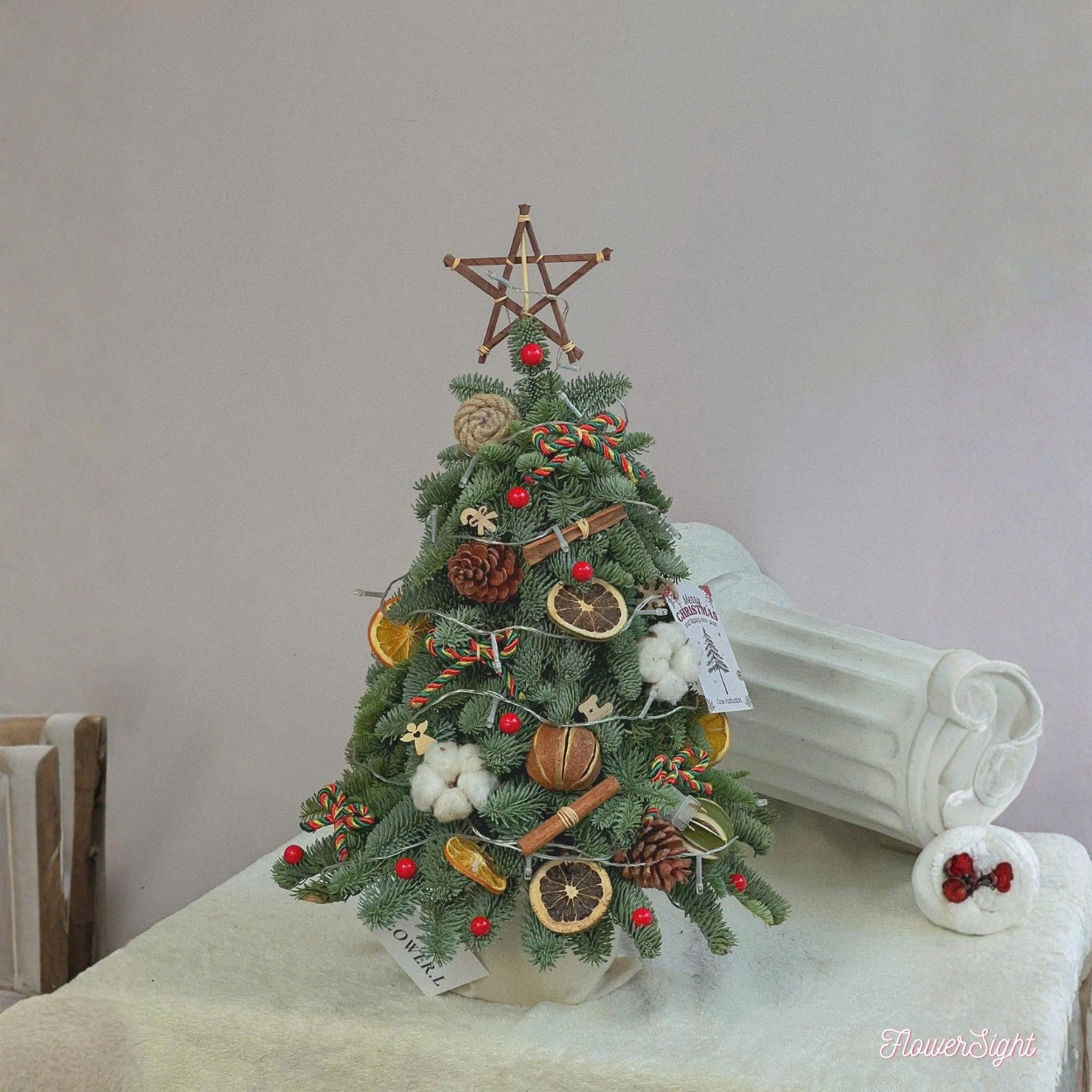 Dorothea là phiên bản cây thông noel tươi dành cho những ai yêu vẻ mộc và sạch. Thân tán lá thông xanh lạnh được xếp tầng gọn gàng, tạo phom hình tháp rõ nét; những điểm nhấn đỏ – trắng – nâu đậm chất mùa đông khiến tổng thể vừa ấm, vừa trang nhã. Đặt Dorothea trên bàn làm việc, quầy lễ tân hay bệ cửa sổ, bạn sẽ thấy cả không gian “thở” theo nhịp Giáng Sinh: nhẹ, trong và rất có gu.