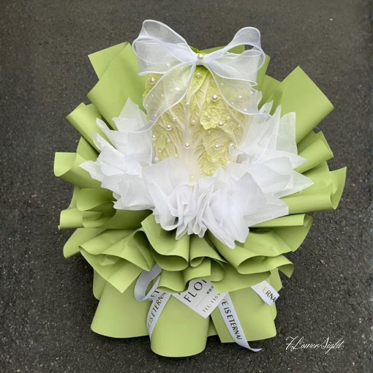 Trung tâm là bắp cải thảo được chọn kỹ với đường gân lá nổi rõ, sắc xanh chuyển trắng tự nhiên. Bề mặt lá được đính hạt ngọc nhỏ, gợi liên tưởng đến giọt sương đọng trên vườn rau buổi sớm. Bao quanh là tầng giấy trắng mềm, được xếp nếp tạo khối như lớp cánh bông phủ nhẹ, vừa che chắn vừa nâng đỡ phần nhân trung tâm. Lớp giấy gói xanh lụa mờ ở ngoài cùng được cuộn và uốn tạo thành các ống gợn sóng. Nhờ vậy bó hoa có biên dạng tròn đầy, nhìn ngang có chiều sâu, nhìn từ trên có hiệu ứng xoáy thị giác rất bắt mắt.