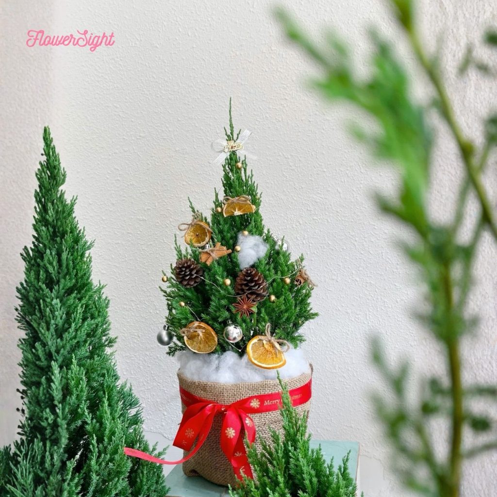 Ngay khi chạm mắt, Ember gợi cảm giác như một bếp lửa nhỏ giữa phòng khách: ấm, thơm, và rất đời. Nền xanh mướt của cây tùng thơm tỏa mùi citrus dịu nhẹ; những lát cam sấy óng mật và trái thông nâu trầm tạo chiều sâu mộc mạc; vài trái châu ánh bạc – vàng phản chiếu đèn lấp lánh như những đốm than. Toàn bộ được “ôm” bởi lớp vải bố và chiếc nơ đỏ Merry Christmas, cho cảm giác thủ công tinh tế nhưng vẫn sang trọng. Đây là dáng thông gọn gàng, cân đối theo tỉ lệ 2/3–1/3 (tán – chậu) để khi đặt trên kệ tivi, bàn làm việc hay quầy lễ tân đều vừa vặn, không lấn át không gian.