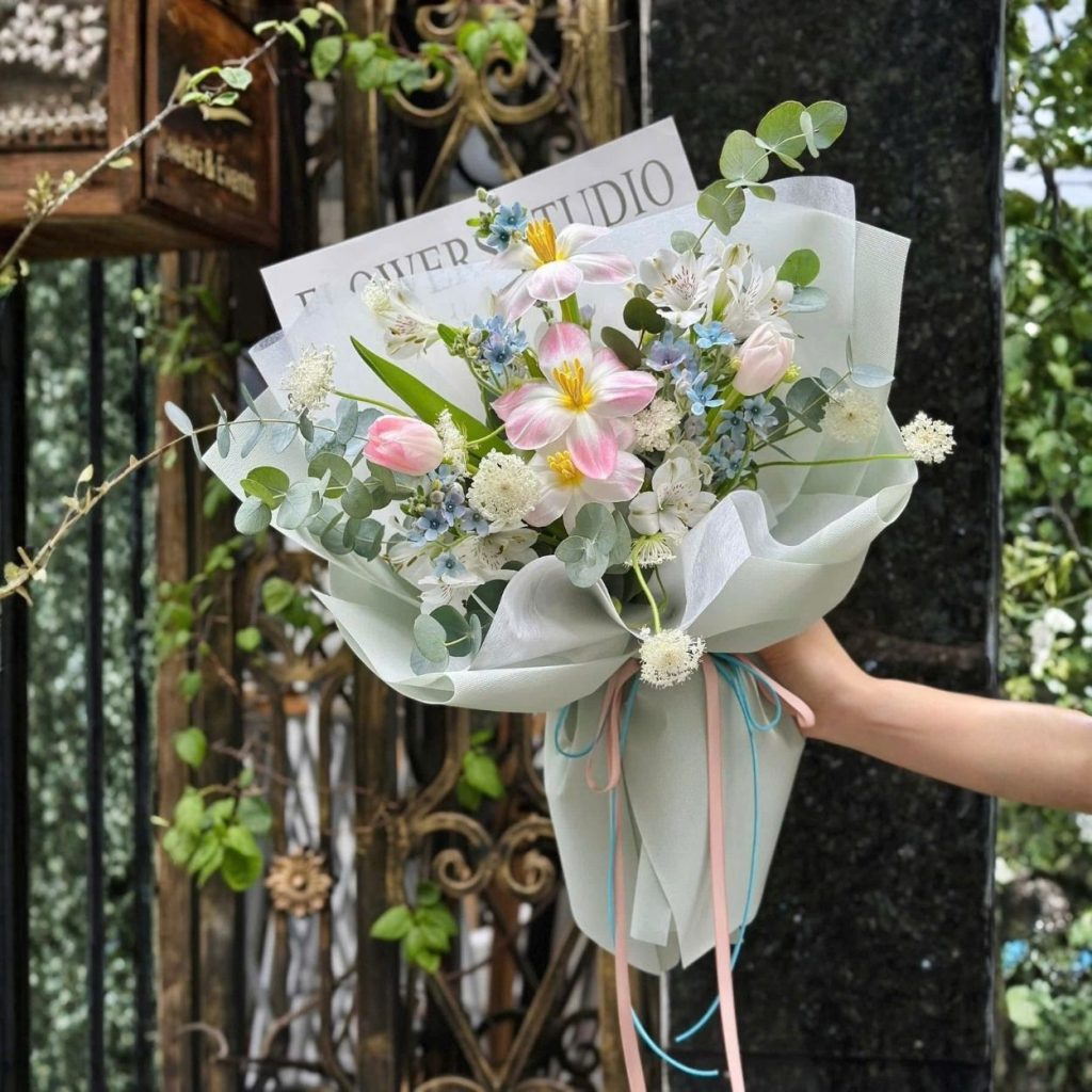 Bảng màu của “Esperanza” là tổ hợp dịu mắt: hồng phấn – trắng ngà – xanh lam – xanh bạc. Hồng đến từ tulip và nhị thủy tiên, trắng từ những bông thủy tiên nở mịn, xanh lam tinh tế của sao xanh, xanh bạc đến từ tán eucalyptus phủ phấn. Lớp giấy gói lựa tông sương mờ xám ngọc, kết hợp một lớp voan trắng ở trong để tăng hiệu ứng phản sáng; mép giấy bẻ mềm, bản lớn, tạo bồng bềnh như mây. Dải nơ đôi pastel (hồng phấn và xanh biển nhạt) rủ tự nhiên, kết thúc bằng đuôi dài thả nhẹ, hoàn thiện tổng thể thanh lịch.