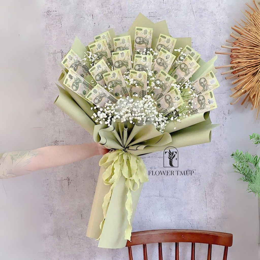 Ethereal Garden là cảm giác dịu mát ngay khi chạm mắt. Từ sắc xanh lá êm đềm của giấy gói đến làn mây baby trắng phủ quanh, mọi chi tiết đều hướng đến sự nhẹ nhàng mà tinh tế. Tiền 100k được xếp khéo thành vòm quạt mở rộng, tầng cao thấp nhịp nhàng như một khu vườn xanh mướt vừa thức giấc trong nắng sớm. Đây là món quà khiến người nhận mỉm cười vì tính thẩm mỹ chỉn chu và cảm xúc được gói ghém trọn vẹn.