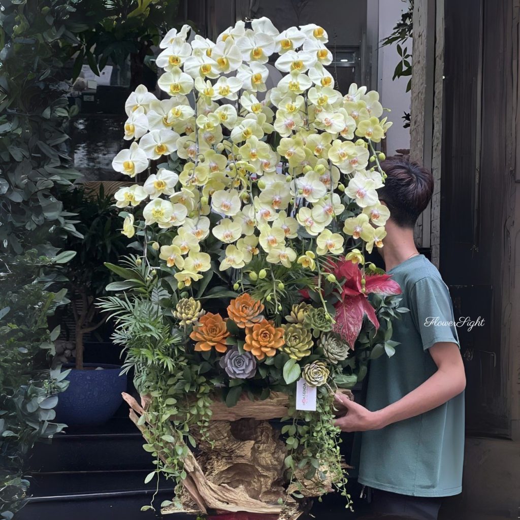 Chậu Lan Hồ Điệp Đại First LoveĐiểm nhấn đặc biệt của First Love nằm ở sự hiện diện của lan điệp đại, loài hoa mang vẻ đẹp quý phái và bền lâu. Sự góp mặt của hoa làm tăng thêm giá trị thẩm mỹ, đồng thời tượng trưng cho may mắn và thịnh vượng.