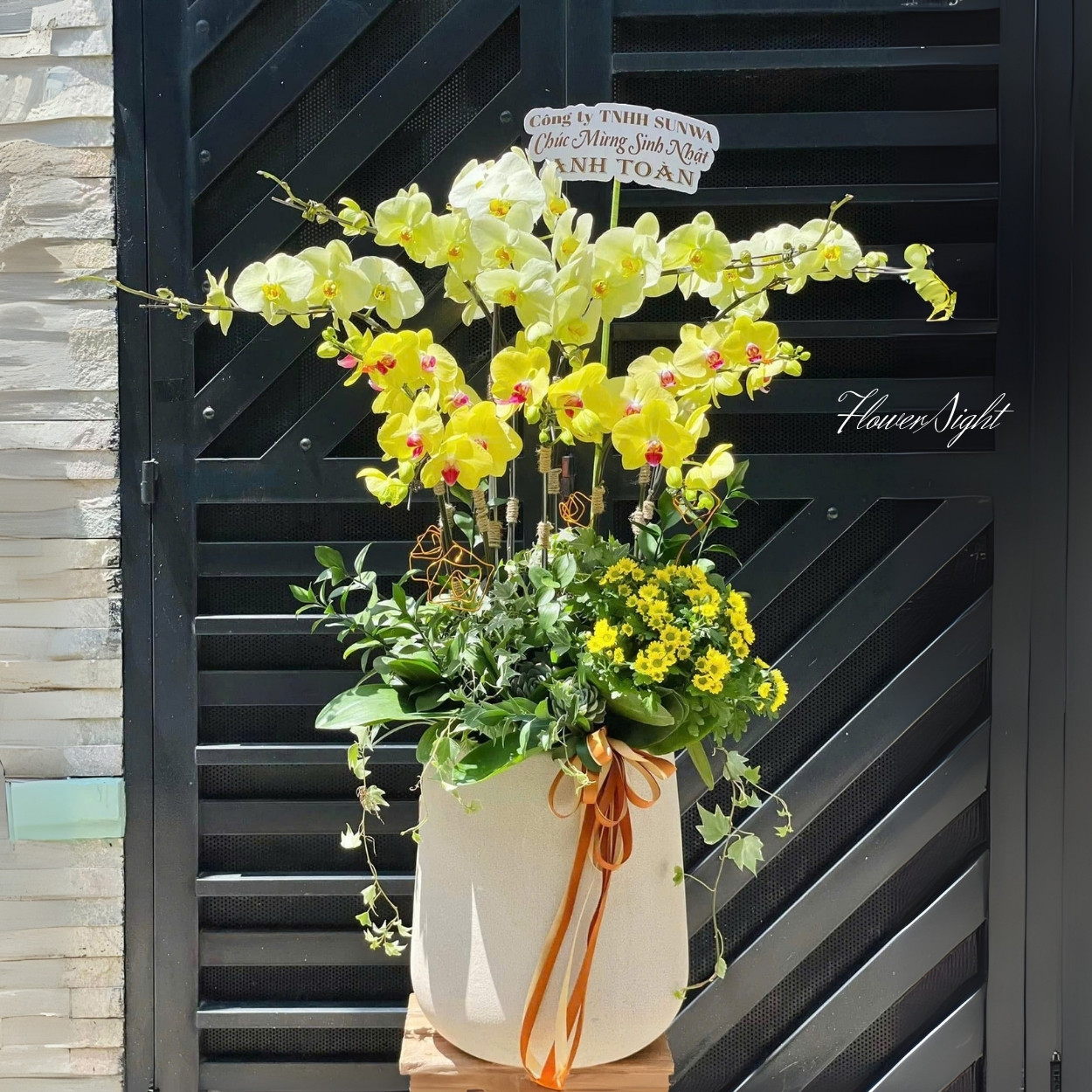 Trong dịp sinh nhật, chậu hoa lan thay lời nhắn nhủ niềm vui và hạnh phúc. Vẻ đẹp tự nhiên của lan vàng và cúc Rosi mang đến cảm giác may mắn, khởi đầu mới đầy hứa hẹn và lưu giữ kỷ niệm khó quên cho người nhận.