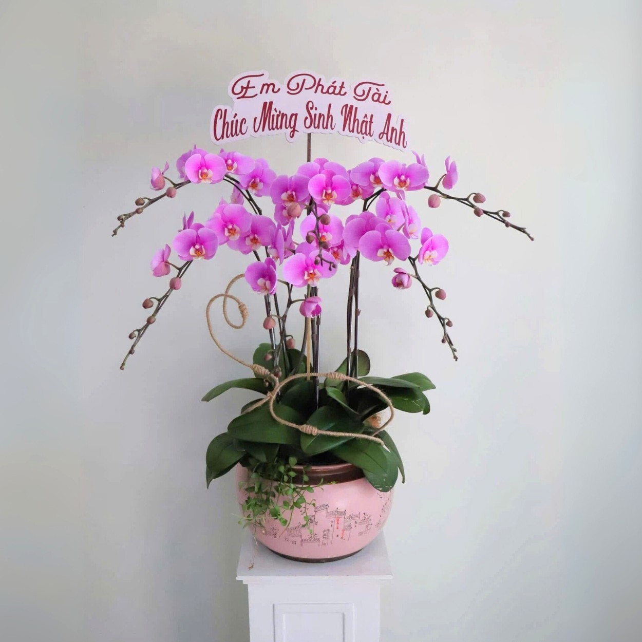 Trong dịp khai trương cửa hàng nhỏ, mừng sinh nhật hoặc các ngày lễ như 20/10, 8/3, chậu lan này là món quà tinh tế để gửi lời chúc may mắn, hạnh phúc và thành công. Tổng thể hài hòa với lan và dây rừng tạo cảm giác vui tươi, tươi mới và đầy ý nghĩa.