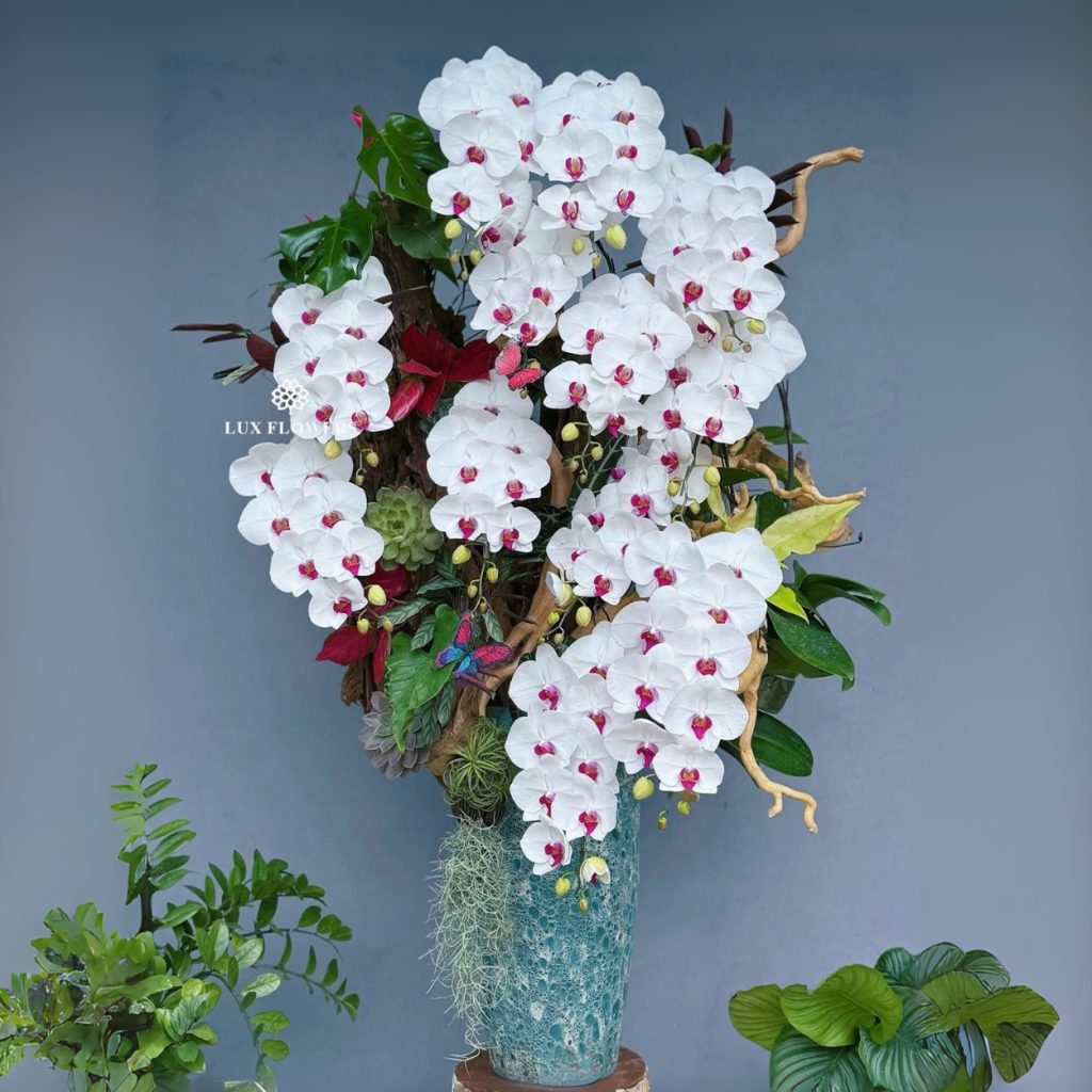 Happy Flower gây ấn tượng với sự kết hợp tinh tế giữa lan hồ điệp trắng thanh khiết và các thành phần lá phụ, lũa gỗ cùng tùng xanh mượt mà. Từng chi tiết hòa quyện tạo nên tổng thể hài hòa, vừa sang trọng vừa gần gũi với thiên nhiên, giúp không gian thêm phần tươi mới và ấm áp.