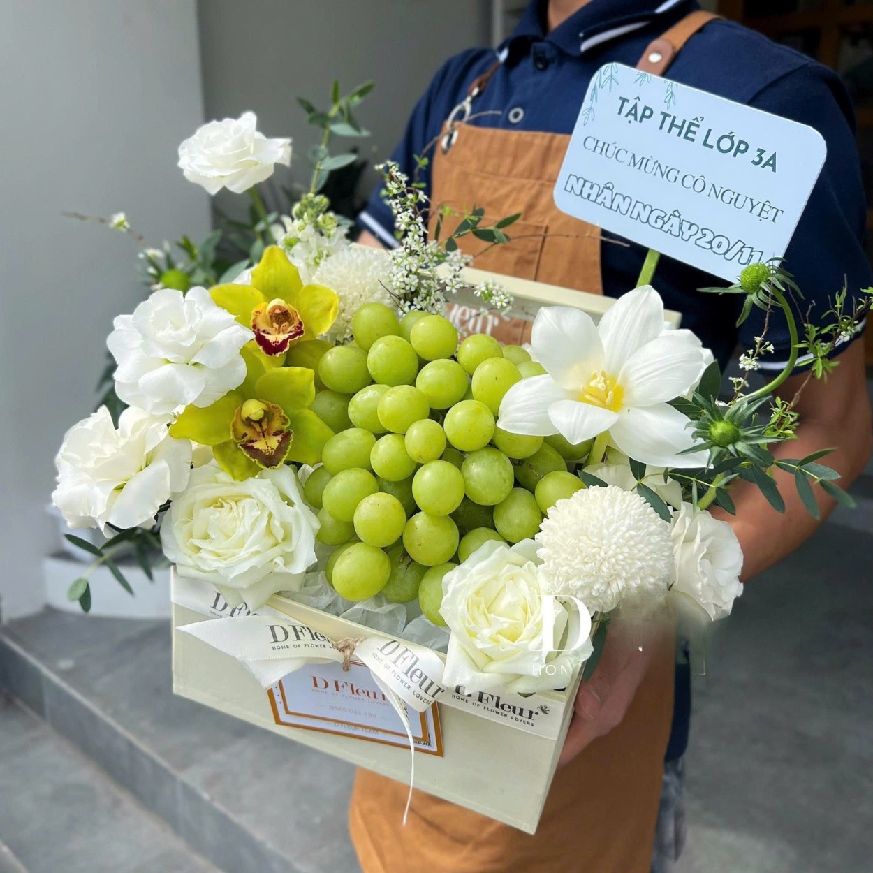 “Harper Mae” lấy chùm nho xanh làm trái tim bố cục: những quả nho tròn mọng xếp tầng, tạo khối căng đầy sức sống và cảm giác “fresh” ngay khi mở hộp. Bao quanh là nền trắng – kem của hoa hồng và cát tường, nhấn nhá ping pong tròn xinh để giữ nhịp hình khối. Cành lan xanh non và tulip tạo nét hiện đại, điểm rơi ánh nhìn tinh tế. Tuyết mai như hạt sương li ti, giúp tổng thể trở nên dịu nhẹ và có chiều sâu; lá kiếm vươn thoát hình, dẫn mắt theo chiều ngang của chiếc hộp. Tất cả được đặt trong hộp gỗ thanh mộc, hoàn thiện với dải ruy băng mềm – một bức tranh “fresh & clean” chuẩn phong cách đương đại.