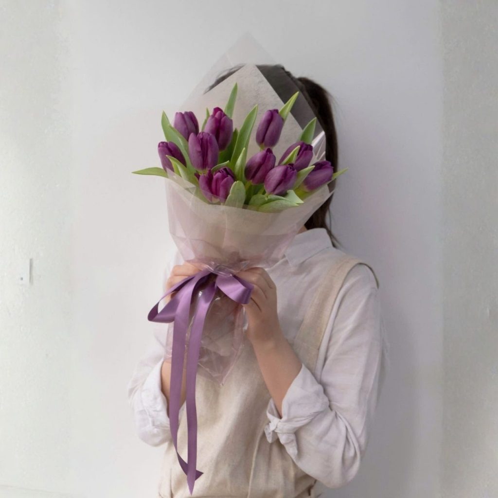 Ngay khi chạm mắt, Haru Haru mang đến cảm giác dịu mát như buổi sớm vừa thức dậy. Sắc tím của tulip được tiết chế vừa đủ để nổi bật trên nền giấy gói tím mờ, tạo nên một tổng thể tinh khôi và rất thời trang. Bó hoa gồm 7 bông tulip tím đang độ nở vừa, cánh khép nhẹ ôm lấy nhuỵ, thân thẳng và khỏe.