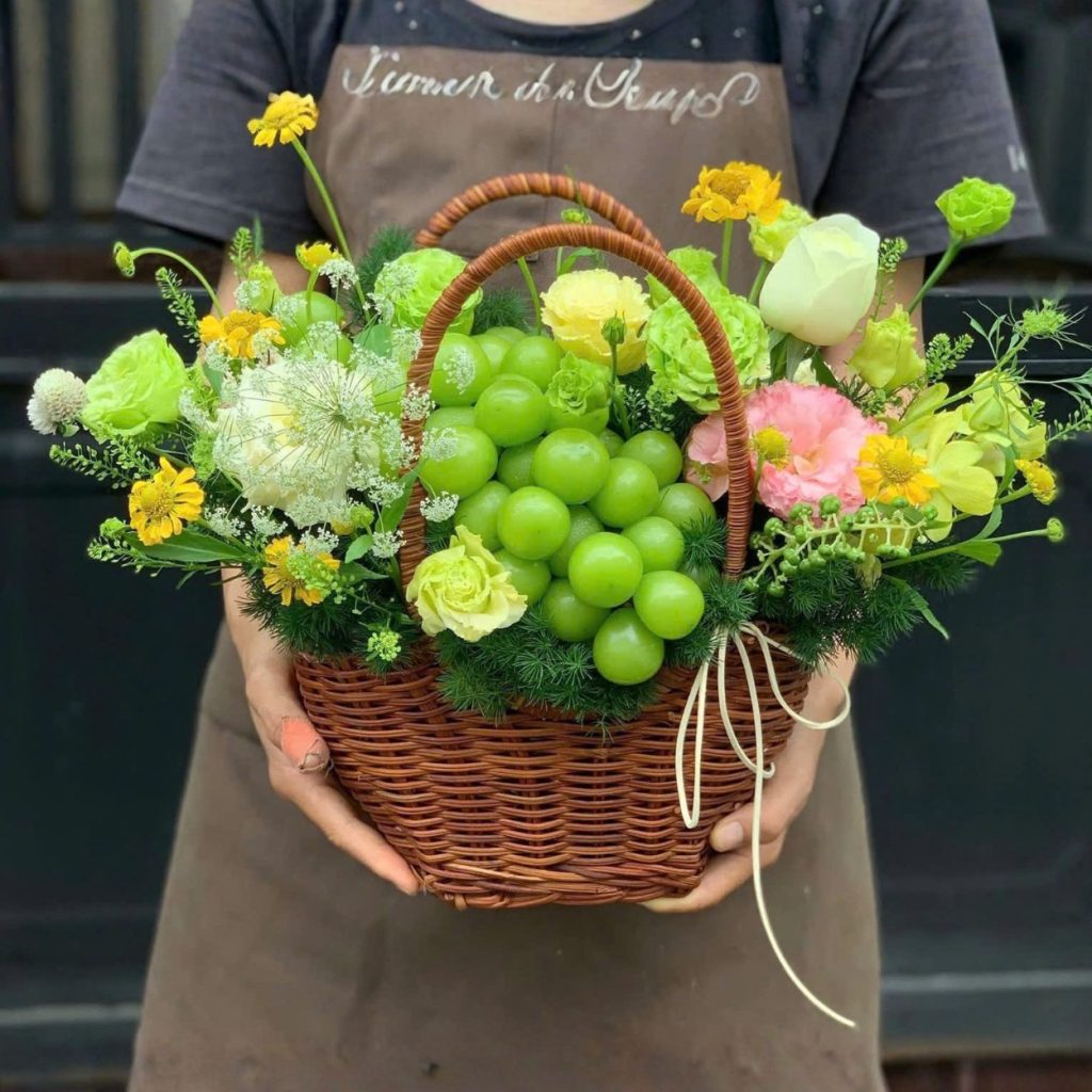 Mỗi trái nho xanh mọng được sắp xếp cẩn thận, phối hợp cùng sắc hoa hồng trắng hoặc xanh nhạt, tạo điểm nhấn thanh thoát nhưng vẫn đầy sức sống. Người nhận sẽ cảm nhận được sự quan tâm, tỉ mỉ và tình cảm chân thành qua từng chi tiết nhỏ.