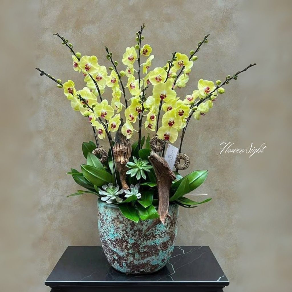 Trong ngày sinh nhật, hoa lan vàng là lựa chọn hoàn hảo để gửi lời chúc an lành, hạnh phúc và khởi đầu mới đầy may mắn. Sự kết hợp tinh tế giữa gỗ lũa và sen đá, lan mang lại vẻ đẹp sinh động, thanh lịch và trang nhã. Chậu hoa giúp người nhận cảm nhận được sự quan tâm, trân trọng và niềm vui trọn vẹn suốt cả ngày.