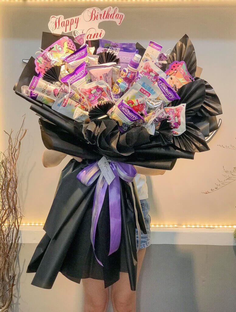 Màu tím từ những gói bánh, kẹo, bim bim tạo cảm giác nhẹ nhàng và lãng mạn, hài hoà mà không quá phô trương. Bó hoa bánh kẹo màu tím có tạo thiết kế rất bắt mắt, khá hợp gu với các bạn nữ gen Z.