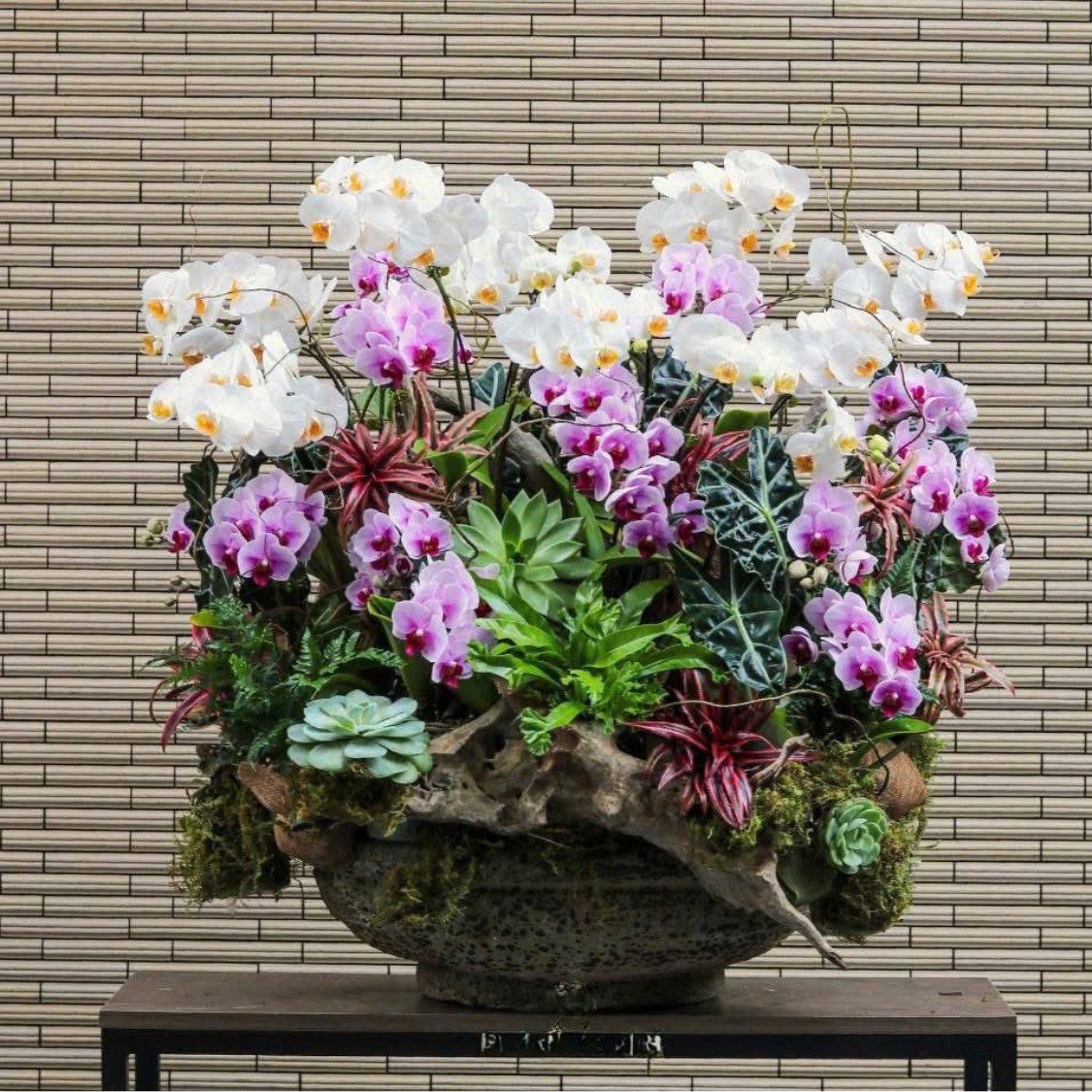 Chậu hoa là sự kết hợp khéo léo giữa sắc màu và hình khối, tạo nên tổng thể vừa sinh động vừa thanh lịch. Điểm nhấn nổi bật là hoa lan hồ điệp màu trắng và tím, tượng trưng cho sự sang trọng và tinh khiết.