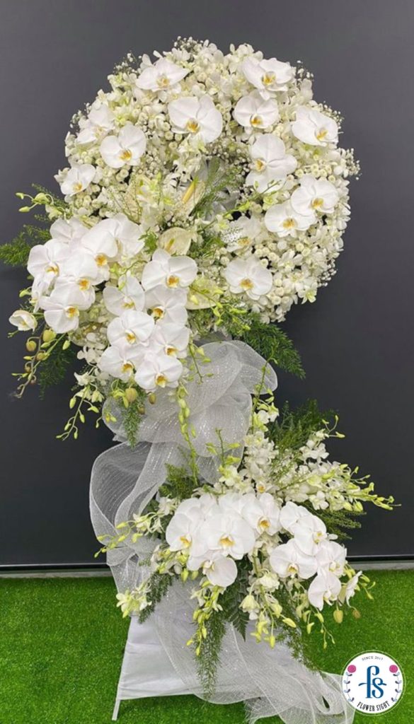 Sang trọng và sâu lắng, kệ hoa Dòng Thời Gian nổi bật với hoa lan hồ điệp và hoa hồng trắng. Mỗi bông hoa như một lời hồi tưởng về những kỷ niệm đẹp đã qua, một sự tôn vinh người đã mất và những dấu ấn họ để lại trong cuộc đời. Đây là cách bày tỏ sự thương tiếc và trân trọng vô hạn.