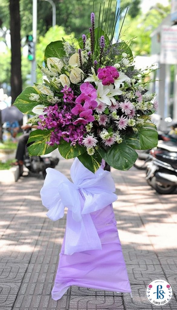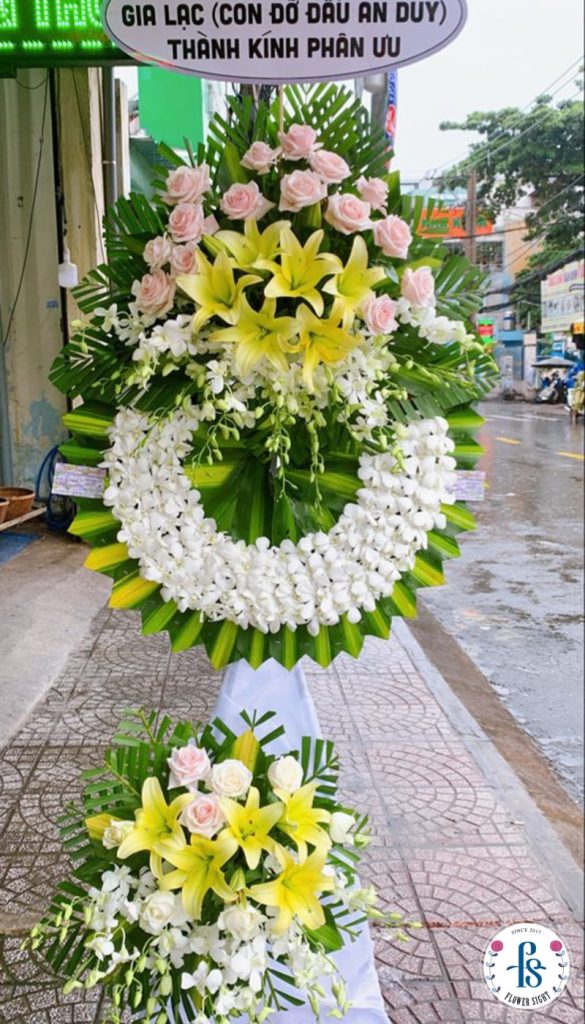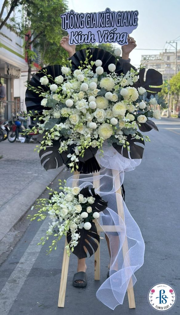 Là một lựa chọn hiện đại và trang trọng, kệ hoa hay lẵng hoa là cách bày tỏ lời chia buồn tinh tế. Chúng thường được đặt trang trọng tại nhà tang lễ hoặc bên cạnh linh cữu, góp phần làm cho không gian tang lễ thêm phần ấm áp, thể hiện sự sẻ chia và lòng thành kính đối với người đã ra đi và gia đình họ.